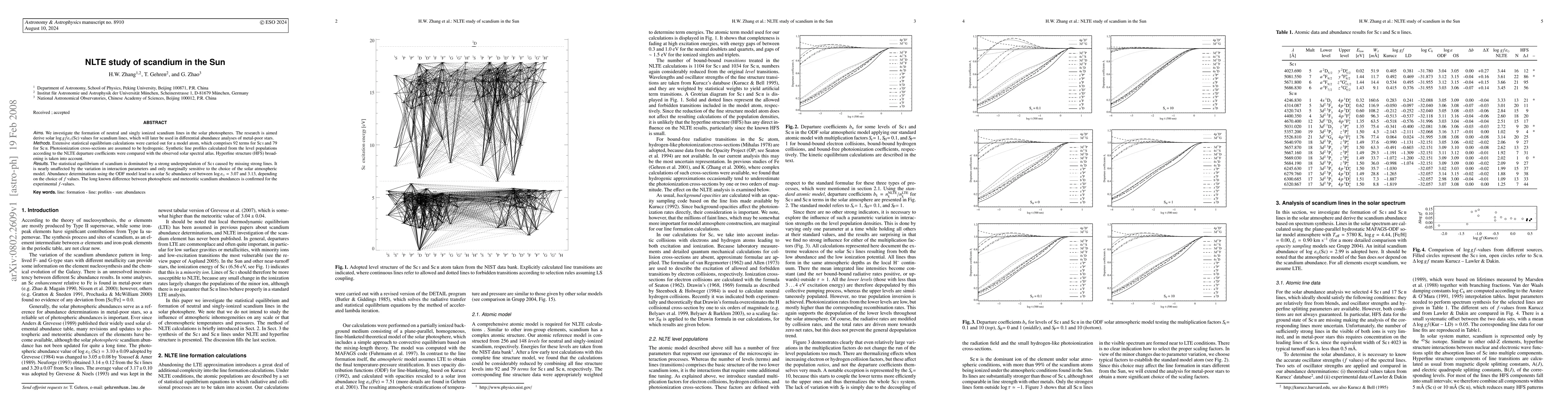 We investigate the formation of neutral and singly ionized scandium lines in the solar photospheres. The research is aimed derive solar $\log gf\epsilon_{\odot}$(Sc) values for scandium lines, which will later be used in differential abundance analyses of metal-poor stars. Extensive statistical equilibrium calculations were carried out for a model atom, which comprises 92 terms for \ion{Sc}{i} and 79 for \ion{Sc}{ii}. Photoionization cross-sections are assumed to be hydrogenic. Synthetic line profiles calculated from the level populations according to the NLTE departure coefficients were compared with the observed solar spectral atlas. Hyperfine structure (HFS) broadening is taken into account. The statistical equilibrium of scandium is dominated by a strong underpopulation of \ion{Sc}{i} caused by missing strong lines. It is nearly unaffected by the variation in interaction parameters and only marginally sensitive to the choice of the solar atmospheric model. Abundance determinations using the ODF model lead to a solar Sc abundance of between $\log\epsilon_\odot = 3.07$ and 3.13, depending on the choice of $f$ values. The long known difference between photospheric and meteoritic scandium abundances is confirmed for the experimental $f$-values.
