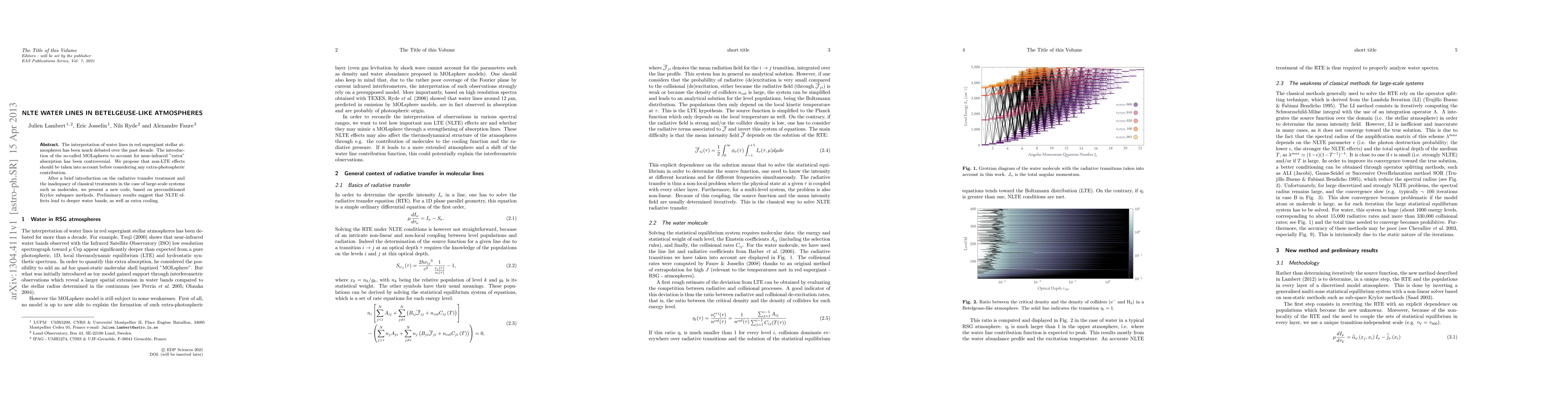 This paper discusses the interpretation of water lines in red supergiant atmospheres, proposing that non-LTE effects should be considered before attributing "extra" absorption to extra-photospheric contributions. A new code utilizing preconditioned Krylov subspace methods is introduced, showing that NLTE effects lead to deeper water bands and additional cooling.