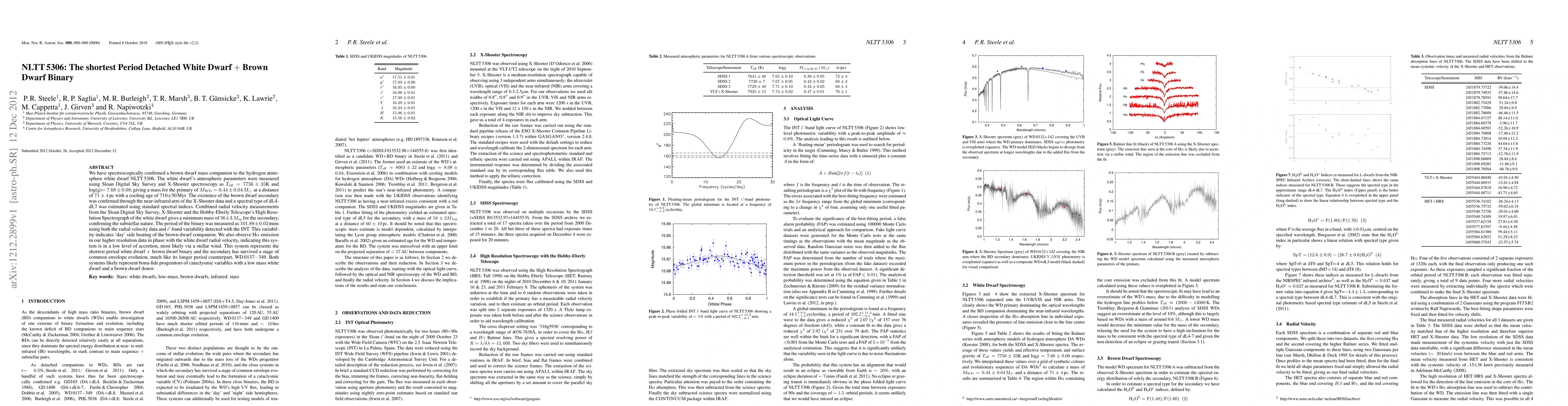We have spectroscopically confirmed a brown dwarf mass companion to the hydrogen atmosphere white dwarf NLTT5306. The white dwarf's atmospheric parameters were measured using Sloan Digital Sky Survey and X-Shooter spectroscopy as T_eff=7756+/-35K and log(g)=7.68+/-0.08, giving a mass for the primary of M_WD=0.44+/-0.04 M_sun, at a distance of 71+/-4 pc with a cooling age of 710+/-50 Myr. The existence of the brown dwarf secondary was confirmed through the near-infrared arm of the X-Shooter data and a spectral type of dL4-dL7 was estimated using standard spectral indices. Combined radial velocity measurements from the Sloan Digital Sky Survey, X-Shooter and the Hobby-Eberly Telescope's High Resolution Spectrograph of the white dwarf gives a minimum mass of 56+/-3 M_jup for the secondary, confirming the substellar nature. The period of the binary was measured as 101.88+/-0.02 mins using both the radial velocity data and i'-band variability detected with the INT. This variability indicates 'day' side heating of the brown dwarf companion. We also observe H{\alpha} emission in our higher resolution data in phase with the white dwarf radial velocity, indicating this system is in a low level of accretion, most likely via a stellar wind. This system represents the shortest period white dwarf + brown dwarf binary and the secondary has survived a stage of common envelope evolution, much like its longer period counterpart, WD0137-349. Both systems likely represent bona-fide progenitors of cataclysmic variables with a low mass white dwarf and a brown dwarf donor.