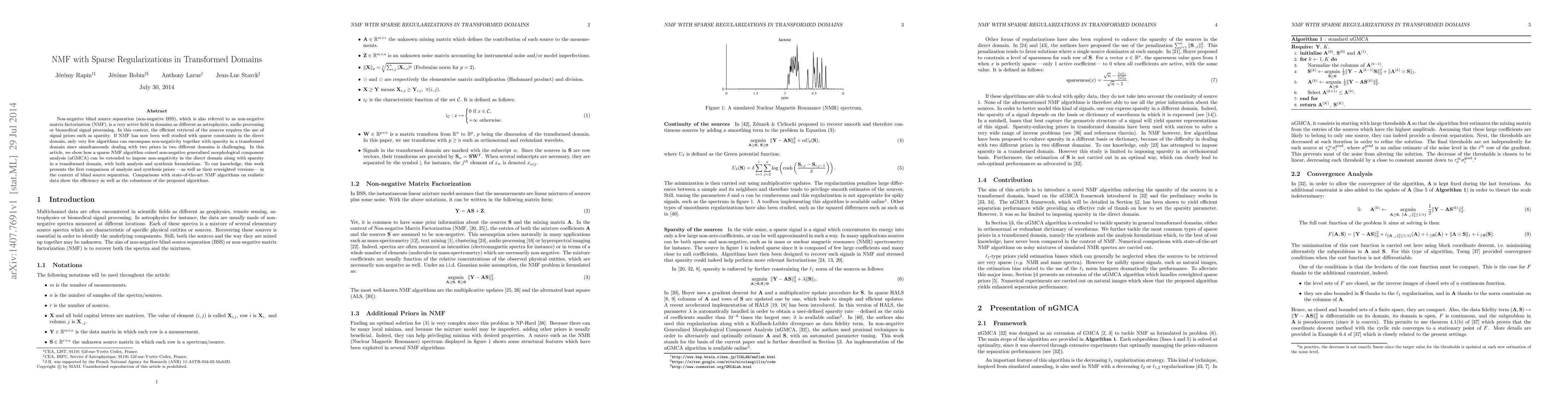 This paper proposes an extension of non-negative generalized morphological component analysis (nGMCA) to incorporate both non-negativity and sparsity in different domains, comparing analysis and synthesis formulations for blind source separation. The results show the efficiency and robustness of the proposed sparse NMF algorithm against state-of-the-art methods.