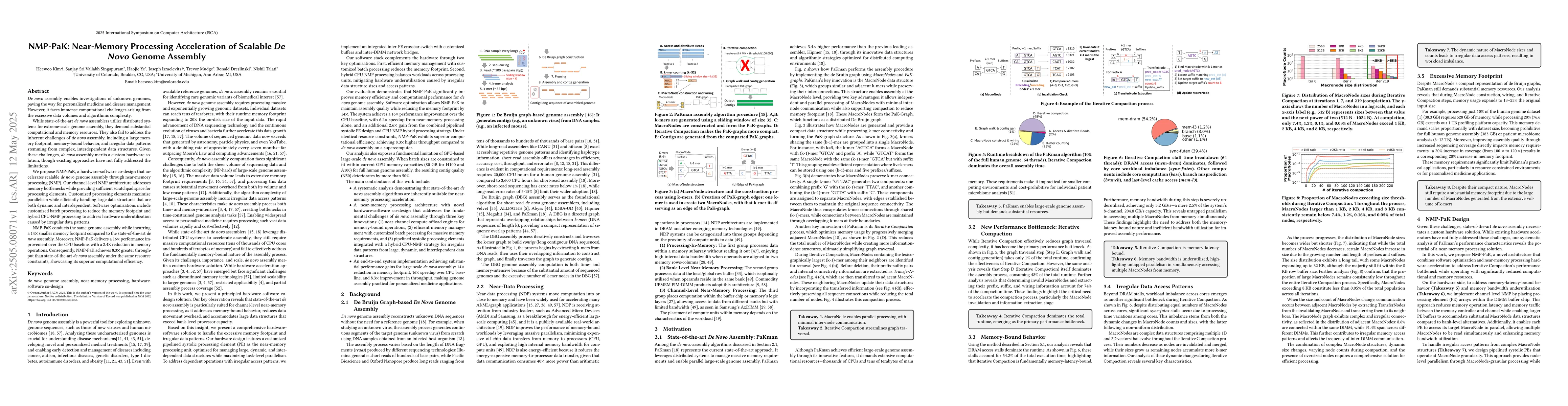 NMP-PaK accelerates de novo genome assembly with a 14X smaller memory footprint and 16X performance improvement over CPU baseline.