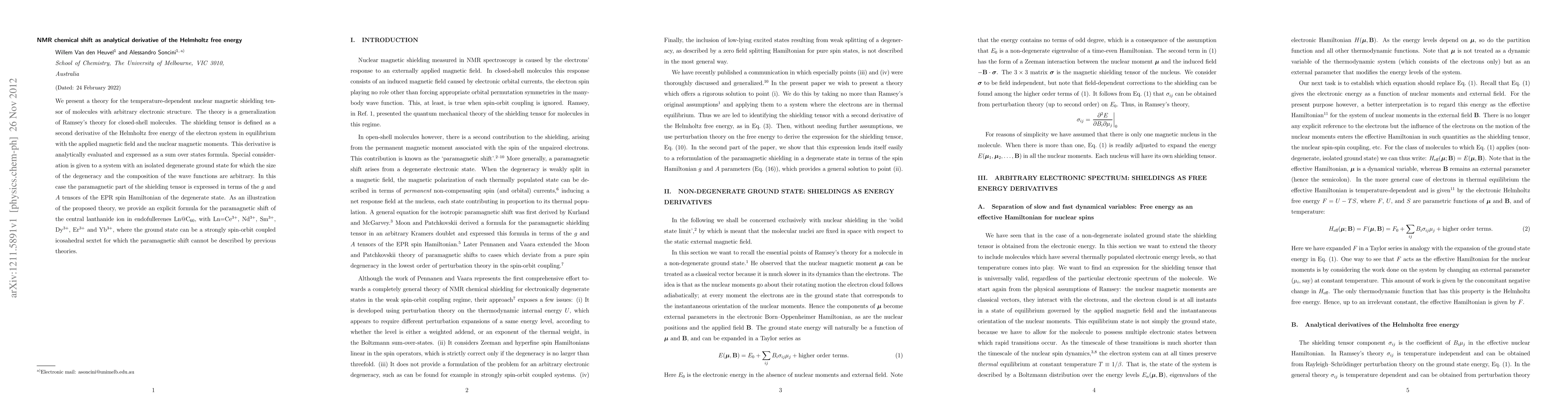 This research presents a theory linking nuclear magnetic resonance (NMR) chemical shifts to the Helmholtz free energy of molecules, extending Ramsey's theory for closed-shell molecules. It provides an analytical expression for the temperature-dependent magnetic shielding tensor as a second derivative of the free energy, considering degenerate ground states. The theory is illustrated with a formula for paramagnetic shifts in lanthanide-fullerene complexes, addressing cases not covered by previous theories.
