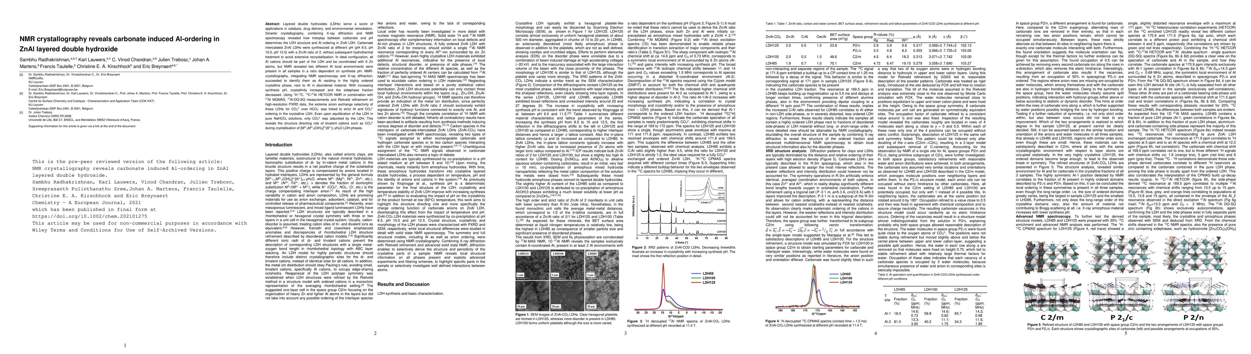 Layered double hydroxides (LDHs) serve a score of applications in catalysis, drug delivery, and environmental remediation. Smarter crystallography, combining X-ray diffraction and NMR spectroscopy revealed how interplay between carbonate and pH determines the LDH structure and Al ordering in ZnAl LDH. Carbonate intercalated ZnAl LDHs were synthesized at different pH (pH 8.5, pH 10.0, pH 12.5) with a Zn/Al ratio of 2, without subsequent hydrothermal treatment to avoid extensive recrystallisation. In ideal configuration, all Al cations should be part of the LDH and be coordinated with 6 Zn atoms, but NMR revealed two different Al local environments were present in all samples in a ratio dependent on synthesis pH. NMR-crystallography, integrating NMR spectroscopy and X-ray diffraction, succeeded to identify them as Al residing in the highly ordered crystalline phase, next to Al in disordered material. With increasing synthesis pH, crystallinity increased, and the side phase fraction decreased. Using 1 H-13 C, 13 C-27 Al HETCOR NMR in combination with 27 Al MQMAS, 27 Al-DQ-SQ measurements and Rietveld refinement on high-resolution PXRD data, the extreme anion exchange selectivity of these LDHs for CO3 2-over HCO3-was linked to strict Al and CO3 2-ordering in the crystalline LDH. Even upon equilibration of the LDH in pure NaHCO3 solutions, only CO3 2-was adsorbed by the LDH. This reveals the structure directing role of bivalent cations such as CO3 2-during crystallization of [M 2+ 4M 3+ 2(OH)2] 2+ [A 2-]1.yH2O LDH phases.