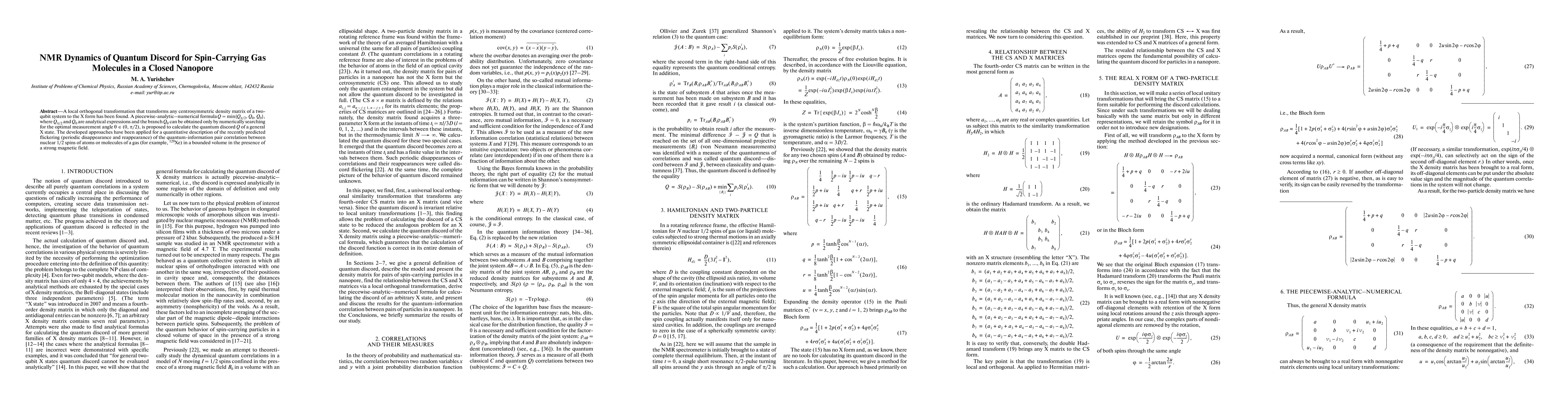 The paper introduces a method to calculate quantum discord (Q) for general X states using a formula Q=min{Q_pi/2,Q_ heta,Q_0}, combining analytical and numerical approaches. This is applied to study flickerings of quantum-information pair correlation in gas molecules with nuclear 1/2 spin under magnetic fields in nanopores.