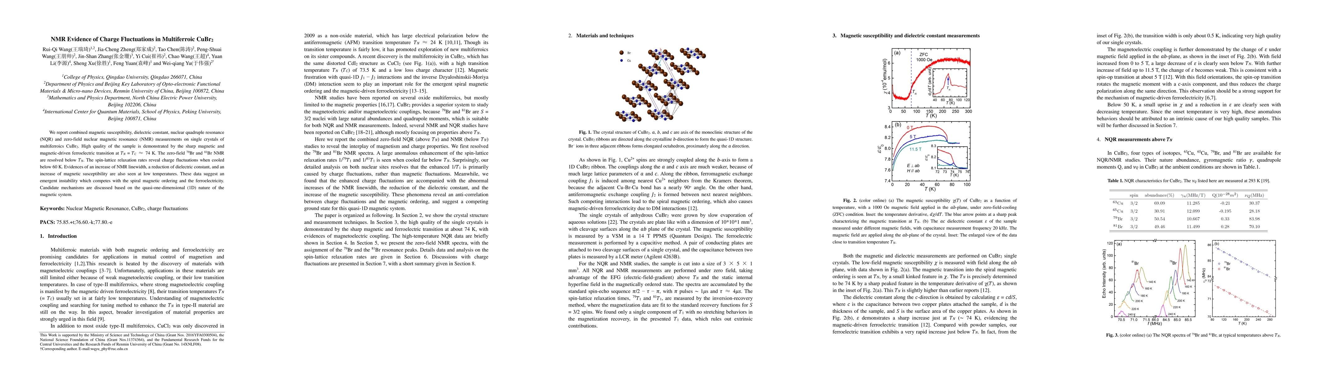 We report combined magnetic susceptibility, dielectric constant, nuclear quadruple resonance (NQR) and zero-field nuclear magnetic resonance (NMR) measurements on single crystals of multiferroics CuBr$_2$. High quality of the sample is demonstrated by the sharp magnetic and magnetic-driven ferroelectric transition at $T_N=T_C\approx$ 74~K. The zero-field $^{79}$Br and $^{81}$Br NMR are resolved below $T_N$. The spin-lattice relaxation rates reveal charge fluctuations when cooled below 60~K. Evidences of an increase of NMR linewidth, a reduction of dielectric constant, and an increase of magnetic susceptibility are also seen at low temperatures. These data suggest an emergent instability which competes with the spiral magnetic ordering and the ferroelectricity. Candidate mechanisms are discussed based on the quasi-one-dimensional (1D) nature of the magnetic system.