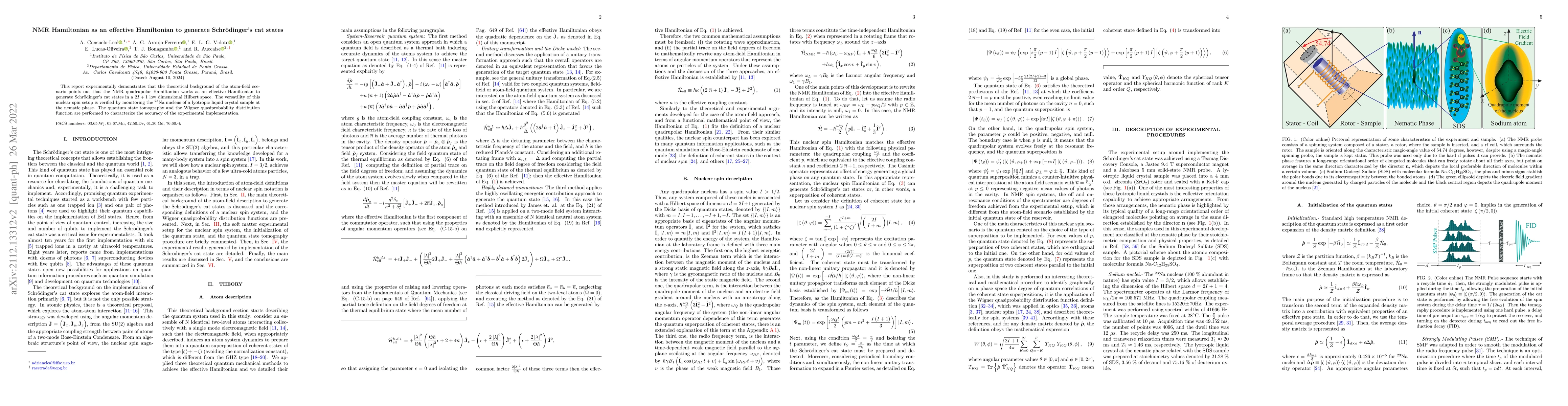 This report experimentally demonstrates that the theoretical background of the atom-field scenario points out that the NMR quadrupolar Hamiltonian works as an effective Hamiltonian to generate Schr\"{o}dinger's cat states in a $2I+1$ low dimensional Hilbert space. The versatility of this nuclear spin setup is verified by monitoring the $^{23}$Na nucleus of a lyotropic liquid crystal sample at the nematic phase. The quantum state tomography and the Wigner quasiprobability distribution function are performed to characterize the accuracy of the experimental implementation.