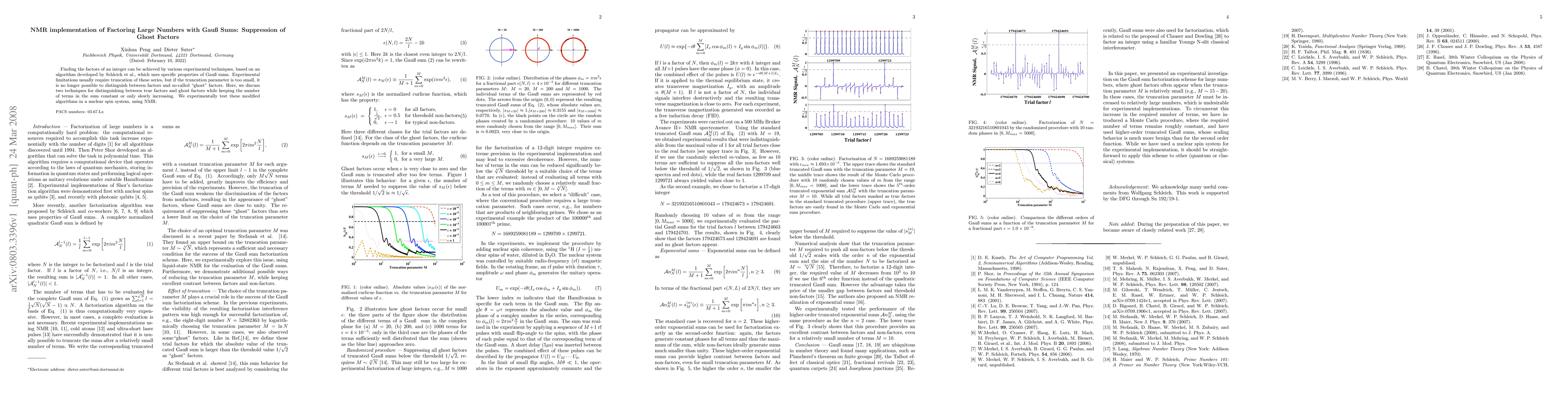 This paper explores the use of NMR to factor large numbers via Gaussian sums, addressing the issue of distinguishing true factors from "ghost" factors when series truncation is necessary. Two techniques are proposed and tested in a nuclear spin system to effectively separate true and ghost factors with minimal increase in the number of terms.