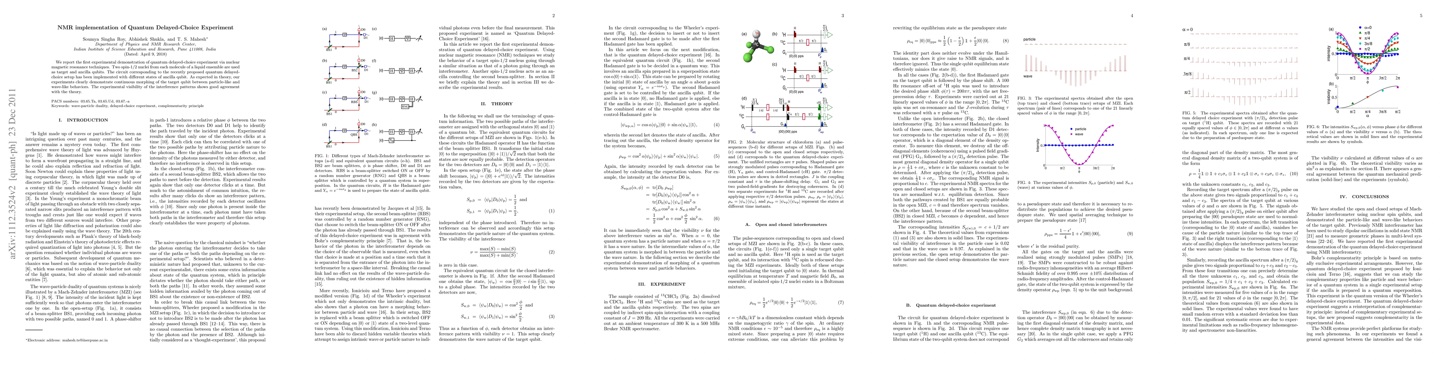 This paper presents the first NMR-based demonstration of a quantum delayed-choice experiment, showing how an ensemble of molecules with spin-1/2 nuclei exhibits both particle-like and wave-like behaviors, with interference pattern visibility matching theoretical predictions.