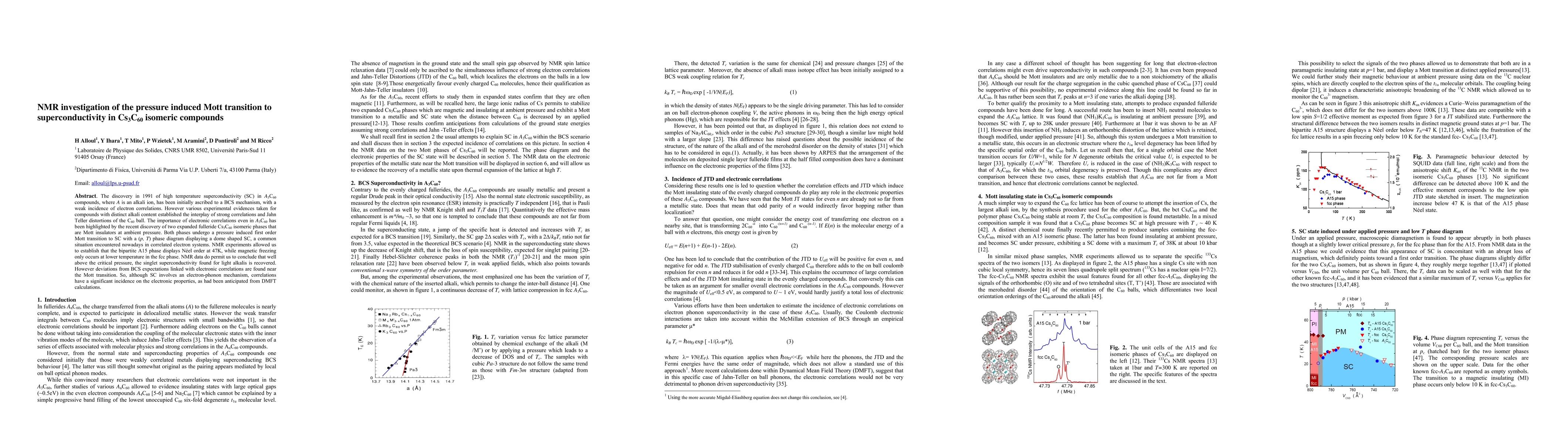 This paper investigates the pressure-induced Mott transition to superconductivity in the Cs3C60 isomeric compounds using NMR. It finds that while superconductivity is electron-phonon mediated, strong electronic correlations significantly influence the transition, deviating from BCS predictions.