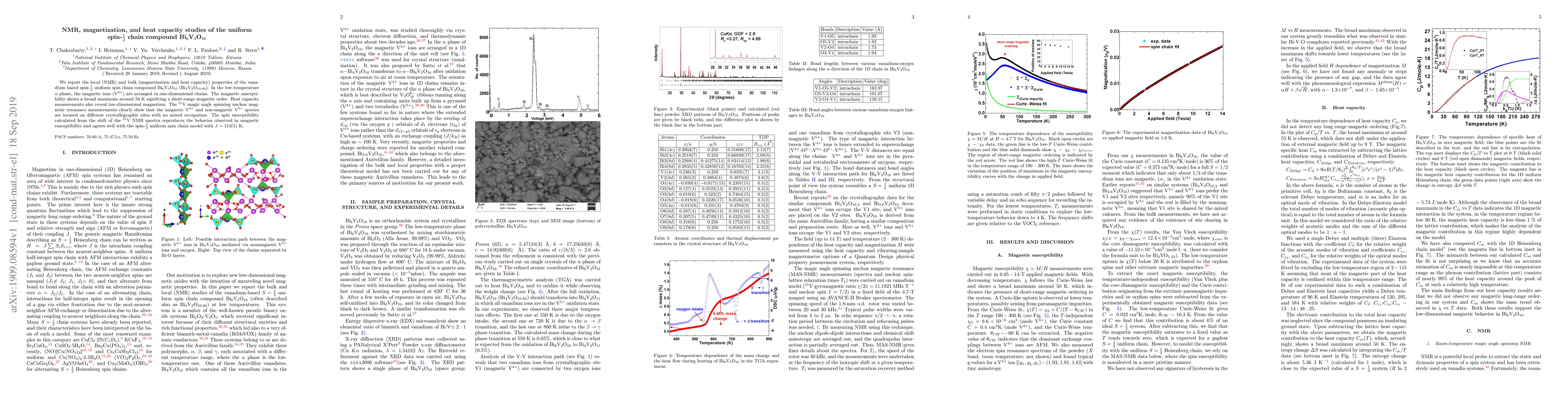We report the local (NMR) and bulk (magnetization and heat capacity) properties of the vanadium-based S=1/2 uniform spin chain compound Bi6V3O16(Bi4V2O10.66). In the low-temperature {\alpha} phase, the magnetic ions (V4+) are arranged in one-dimensional chains. The magnetic susceptibility shows a broad maximum around 50 K signifying a short-range magnetic order. Heat capacity measurements also reveal low-dimensional magnetism. The 51V magic angle spinning nuclear magnetic resonance measurements clearly show that the magnetic V4+ and nonmagnetic V5+ species are located on different crystallographic sites with no mixed occupation. The spin susceptibility calculated from the shift of the 51V NMR spectra reproduces the behavior observed in magnetic susceptibility and agrees well with the S=1/2 uniform spin chain model with J=113(5) K.