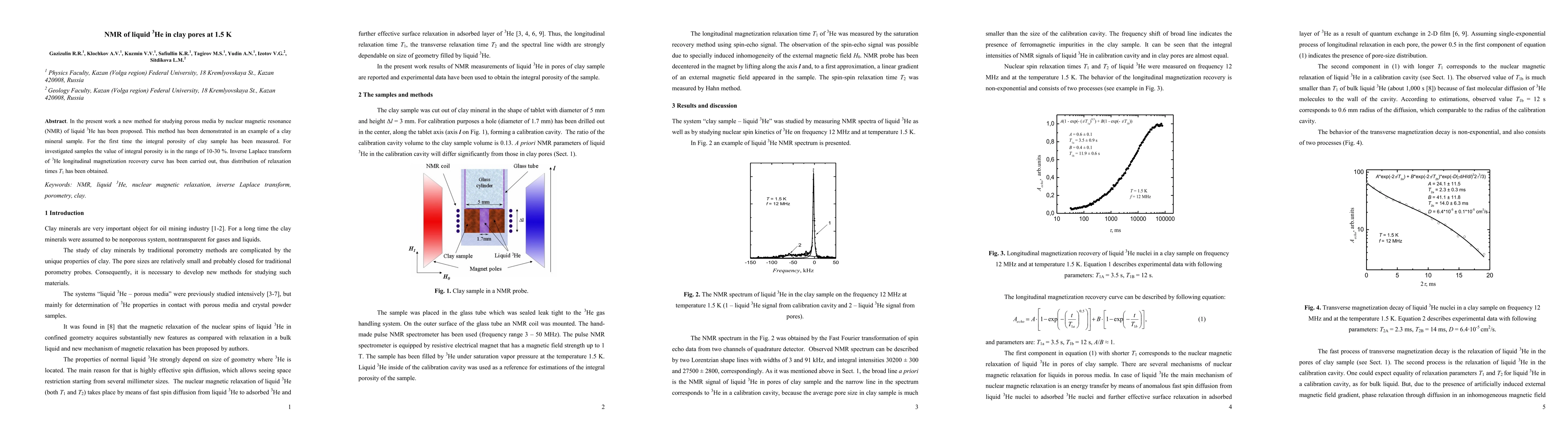 In the present work a new method for studying porous media by nuclear magnetic resonance of liquid 3He has been proposed. This method has been demonstrated in an example of a clay mineral sample. For the first time the integral porosity of clay sample has been measured. For investigated samples the value of integral porosity is in the range of 10-30%. Inverse Laplace transform of 3He longitudinal magnetization recovery curve has been carried out, thus distribution of relaxation times T1 has been obtained.