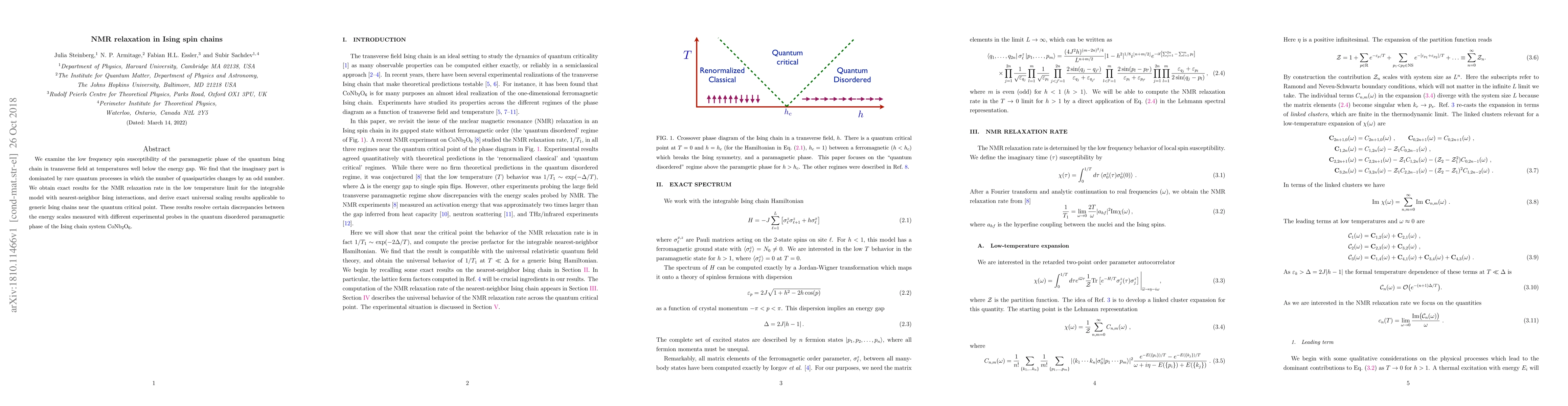 This paper investigates the NMR relaxation in quantum Ising spin chains, revealing that the low-frequency spin susceptibility is dominated by rare quantum processes involving odd quasiparticle changes. Exact results for the NMR relaxation rate in the low-temperature limit are derived, resolving discrepancies in experimental measurements of CoNb$_{2}$O$_{6}$.