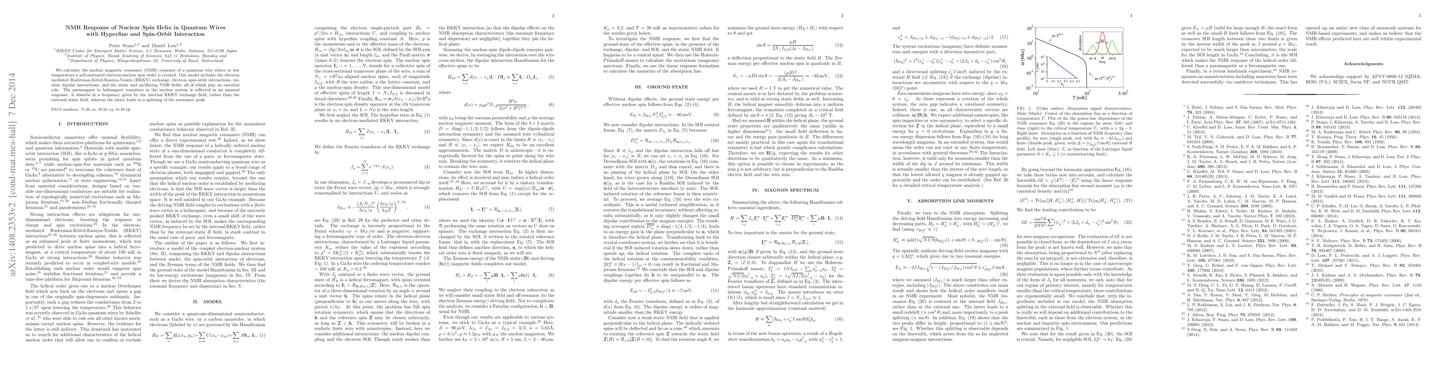 This study investigates the NMR response in quantum wires with nuclear spin helices, revealing that the system exhibits an unusual resonance behavior driven by internal RKKY exchange fields, rather than external static fields, during a paramagnet to helimagnet transition. The model considers RKKY exchange, spin-orbit interactions, and nuclear dipolar interactions.