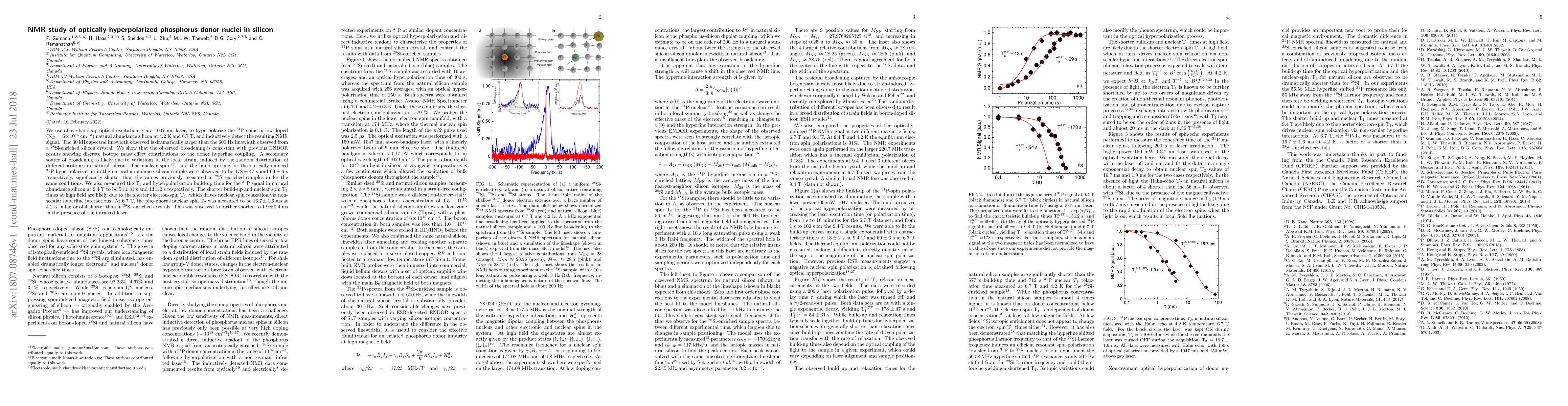 We use above-bandgap optical excitation, via a 1047 nm laser, to hyperpolarize the $^{31}$P spins in low-doped (N$_D =6\times10^{15}$ cm$^{-3}$) natural abundance silicon at 4.2 K and 6.7 T, and inductively detect the resulting NMR signal. The $30$ kHz spectral linewidth observed is dramatically larger than the 600 Hz linewidth observed from a $^{28}$Si-enriched silicon crystal. We show that the observed broadening is consistent with previous ENDOR results showing discrete isotope mass effect contributions to the donor hyperfine coupling. A secondary source of broadening is likely due to variations in the local strain, induced by the random distribution of different isotopes in natural silicon. The nuclear spin T$_1$ and the build-up time for the optically-induced $^{31}$P hyperpolarization in the natural abundance silicon sample were observed to be $178\pm47$ s and $69\pm6$ s respectively, significantly shorter than the values previously measured in $^{28}$Si-enriched samples under the same conditions. We also measured the T$_1$ and hyperpolarization build-up time for the $^{31}$P signal in natural abundance silicon at 9.4 T to be $54\pm31$ s and $13\pm2$ s respectively. The shorter build-up and nuclear spin T$_1$ times at high field are likely due to the shorter electron-spin T$_1$, which drives nuclear spin relaxation via non-secular hyperfine interactions. At 6.7 T, the phosphorus nuclear spin T$_{2}$ was measured to be $16.7\pm1.6$ ms at 4.2 K, a factor of 4 shorter than in $^{28}$Si-enriched crystals. This was observed to further shorten to $1.9\pm0.4$ ms in the presence of the infra-red laser.