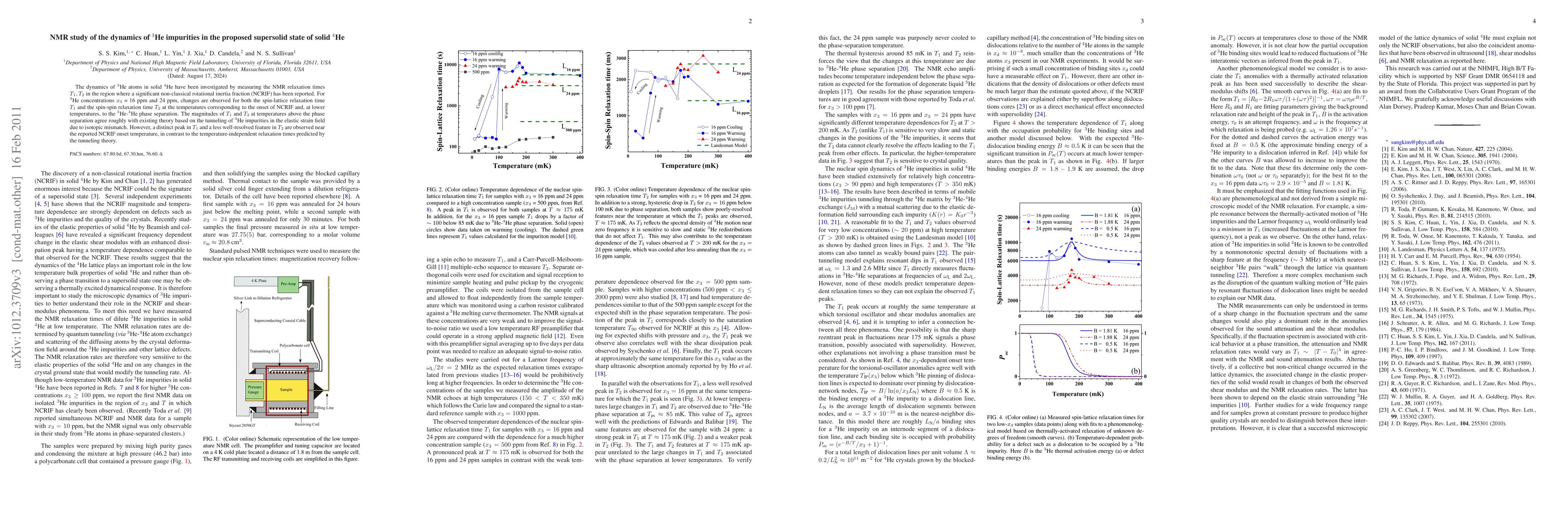 This NMR study investigates the dynamics of 3He impurities in solid 4He, revealing changes in relaxation times T1 and T2 at the onset of non-classical rotational inertia fraction and phase separation. While relaxation times above phase separation align with theoretical predictions of tunneling, distinct peaks in T1 and a feature in T2 near the NCRIF onset contradict the expected temperature-independent behavior.