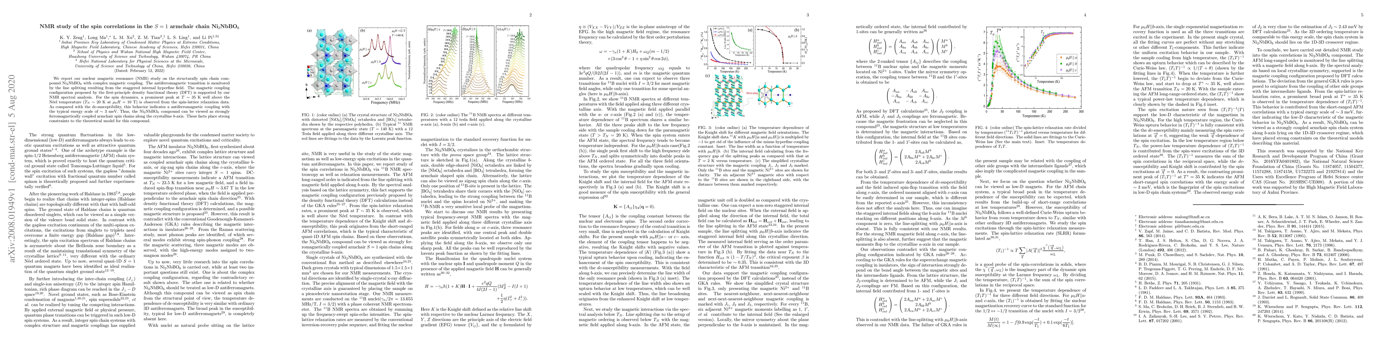 We report our nuclear magnetic resonance (NMR) study on the structurally spin chain compound Ni$_2$NbBO$_6$ with complex magnetic coupling. The antiferromagnetic transition is monitored by the line splitting resulting from the staggered internal hyperfine field. The magnetic coupling configuration proposed by the first-principle density functional theory (DFT) is supported by our NMR spectral analysis. For the spin dynamics, a prominent peak at $T\sim35$ K well above the N\'{e}el temperature ($T_N\sim20$ K at $\mu_0H=10$ T) is observed from the spin-lattice relaxation data. As compared with the dc-susceptibility, this behavior indicates a antiferromagnetic coupling with the typical energy scale of $\sim3$ meV. Thus, the Ni$_2$NbBO$_6$ compound can be viewed as strongly ferromagnetically coupled armchair spin chains along the crystalline $b$-axis. These facts place strong constraints to the theoretical model for this compound.