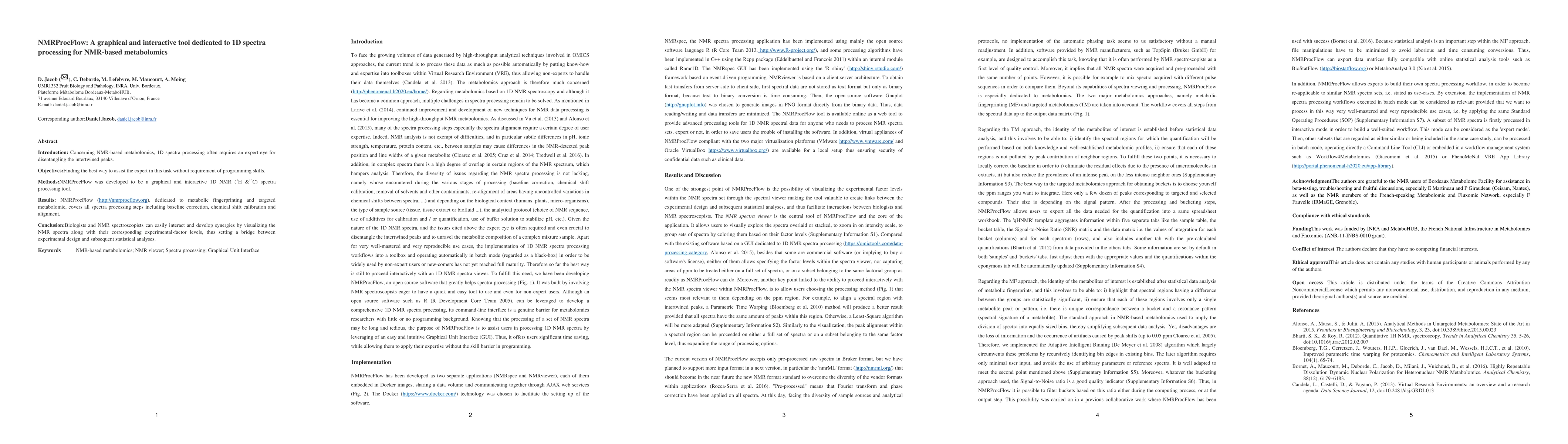 NMRProcFlow is a user-friendly, graphical tool for processing 1D NMR spectra in metabolomics, facilitating interactive baseline correction, chemical shift calibration, and alignment without programming skills. It bridges biologists and spectroscopists by visualizing spectra with experimental data for integrated analysis.