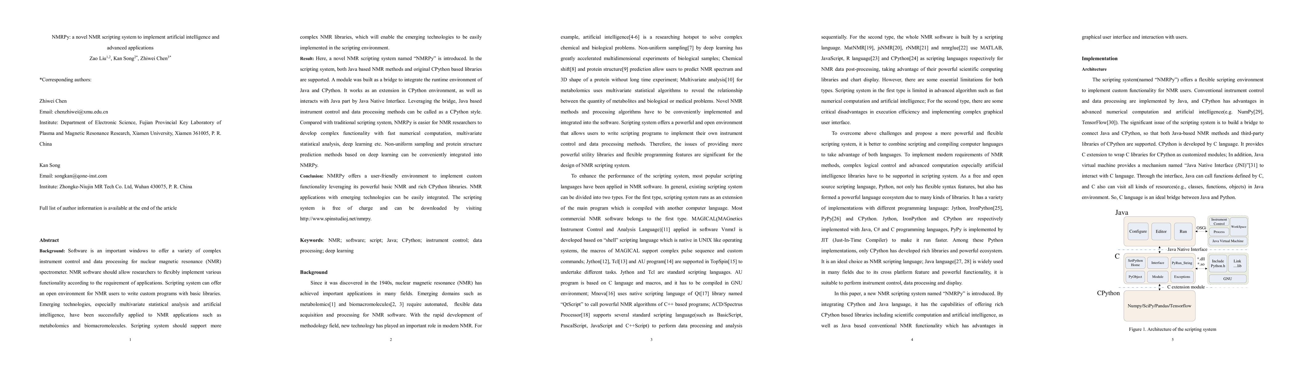 NMRPy, a novel NMR scripting system, integrates Java-based NMR methods and CPython libraries using a bridge that functions as an extension in CPython and interacts with Java via Java Native Interface.