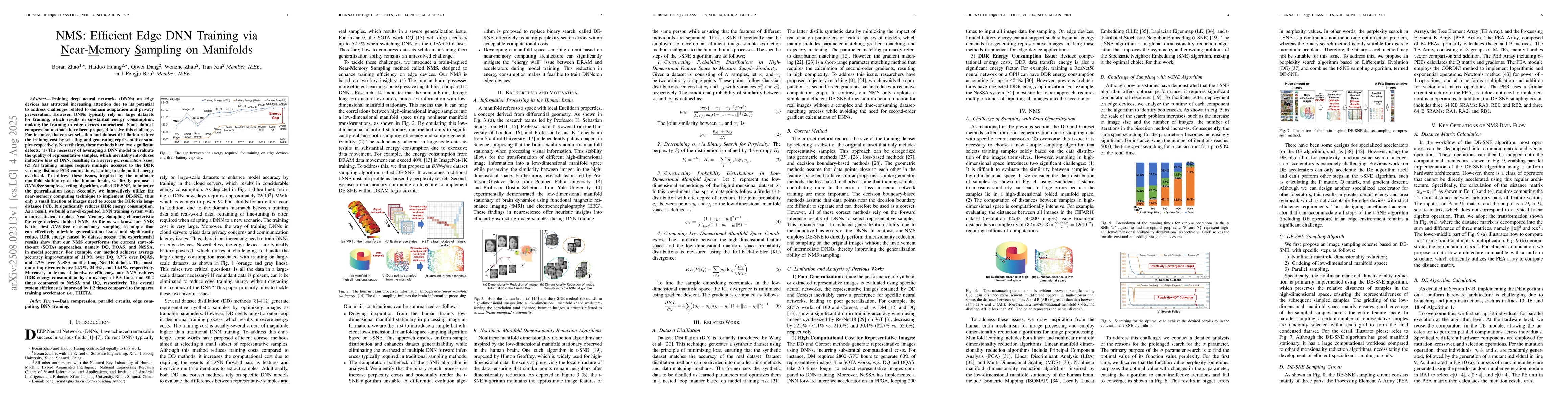 Training deep neural networks (DNNs) on edge devices has attracted increasing attention due to its potential to address challenges related to domain adaptation and privacy preservation. However, DNNs typically rely on large datasets for training, which results in substantial energy consumption, making the training in edge devices impractical. Some dataset compression methods have been proposed to solve this challenge. For instance, the coreset selection and dataset distillation reduce the training cost by selecting and generating representative samples respectively. Nevertheless, these methods have two significant defects: (1) The necessary of leveraging a DNN model to evaluate the quality of representative samples, which inevitably introduces inductive bias of DNN, resulting in a severe generalization issue; (2) All training images require multiple accesses to the DDR via long-distance PCB connections, leading to substantial energy overhead. To address these issues, inspired by the nonlinear manifold stationary of the human brain, we firstly propose a DNN-free sample-selecting algorithm, called DE-SNE, to improve the generalization issue. Secondly, we innovatively utilize the near-memory computing technique to implement DE-SNE, thus only a small fraction of images need to access the DDR via long-distance PCB. It significantly reduces DDR energy consumption. As a result, we build a novel expedited DNN training system with a more efficient in-place Near-Memory Sampling characteristic for edge devices, dubbed NMS. As far as we know, our NMS is the first DNN-free near-memory sampling technique that can effectively alleviate generalization issues and significantly reduce DDR energy caused by dataset access. The experimental results show that our NMS outperforms the current state-of-the-art (SOTA) approaches, namely DQ, DQAS, and NeSSA, in model accuracy.