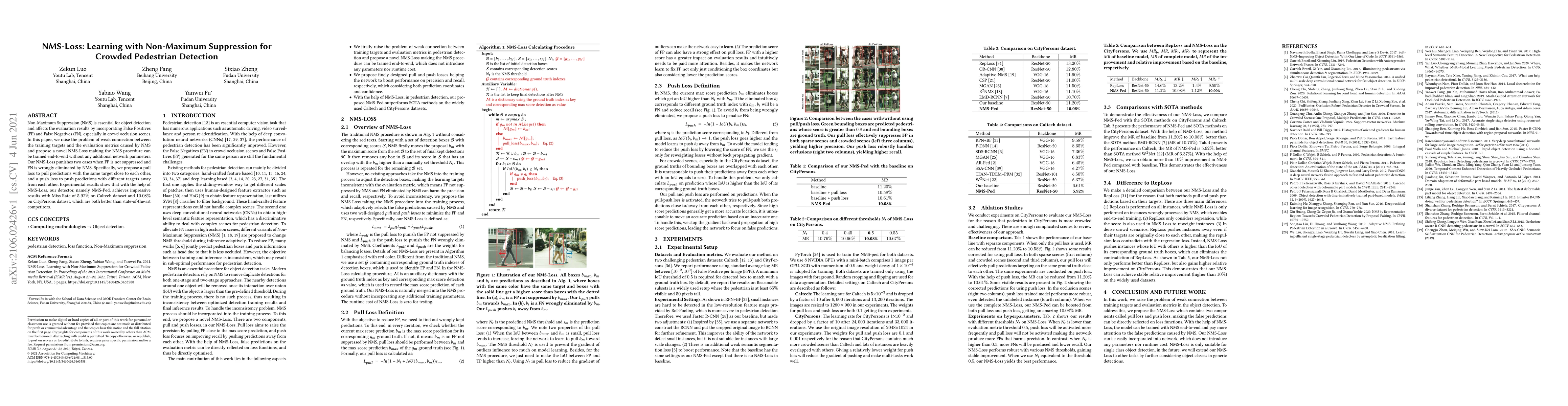 Non-Maximum Suppression (NMS) is essential for object detection and affects the evaluation results by incorporating False Positives (FP) and False Negatives (FN), especially in crowd occlusion scenes. In this paper, we raise the problem of weak connection between the training targets and the evaluation metrics caused by NMS and propose a novel NMS-Loss making the NMS procedure can be trained end-to-end without any additional network parameters. Our NMS-Loss punishes two cases when FP is not suppressed and FN is wrongly eliminated by NMS. Specifically, we propose a pull loss to pull predictions with the same target close to each other, and a push loss to push predictions with different targets away from each other. Experimental results show that with the help of NMS-Loss, our detector, namely NMS-Ped, achieves impressive results with Miss Rate of 5.92% on Caltech dataset and 10.08% on CityPersons dataset, which are both better than state-of-the-art competitors.