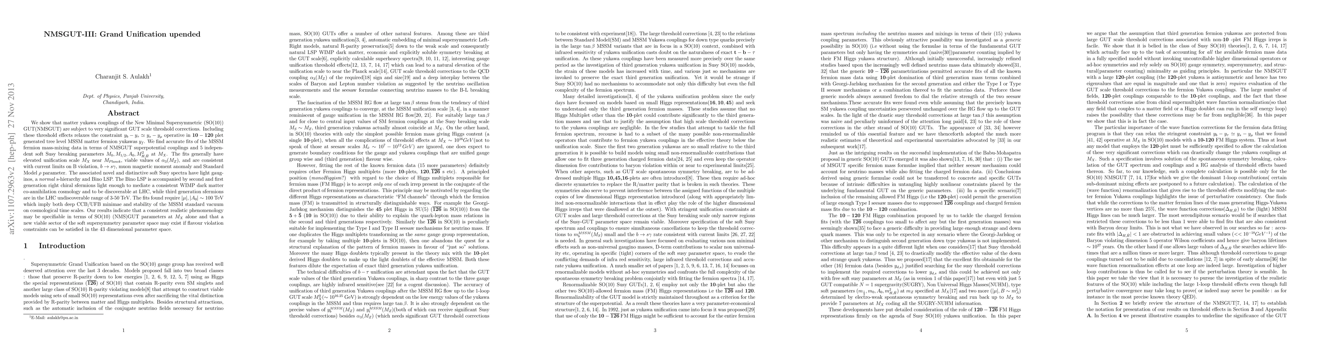 We show that matter yukawa couplings of the New Minimal Supersymmetric (SO(10)) GUT(NMSGUT) are subject to very significant GUT scale threshold corrections. Including these threshold effects relaxes the constraint $ y_b-y_\tau\simeq y_s-y_\mu$ operative in $\textbf{10} -\textbf{120} $plet generated tree level MSSM matter fermion yukawas $y_f$. We find accurate fits of the MSSM fermion mass-mixing data in terms of NMSGUT superpotential couplings and 5 independent soft Susy breaking parameters $M_0, M_{1/2}, A_0, M^2_{H,\bar{H}}$ at $M_X$. The fits generally have elevated unification scale $M_X$ near $M_{Planck}$, viable values of $\alpha_3(M_Z)$, and are consistent with current limits on B violation, $b\rightarrow s\gamma$, muon magnetic moment anomaly and Standard Model $\rho$ parameter. The associated novel and distinctive soft Susy spectra have light gauginos, a \emph{normal} s-hierarchy and Bino LSP. The Bino LSP is accompanied by second and first generation right chiral sfermions light enough to mediate a consistent WIMP dark matter co-annihilation cosmology and to be discoverable at LHC, while third generation sfermions are in the LHC undiscoverable range of 3-50 TeV. The fits found require $|\mu|,|A_0|\sim 100$ TeV which imply both deep CCB/UFB minimae and stability of the MSSM standard vacuum on cosmological time scales. Our results indicate that a consistent realistic phenomenology may be specifiable in terms of SO(10) (NMS)GUT parameters at $M_X$ alone and that a new viable sector of the soft supersymmetry parameter space may exist if flavour violation constraints can be satisfied in the 43 dimensional parameter space.