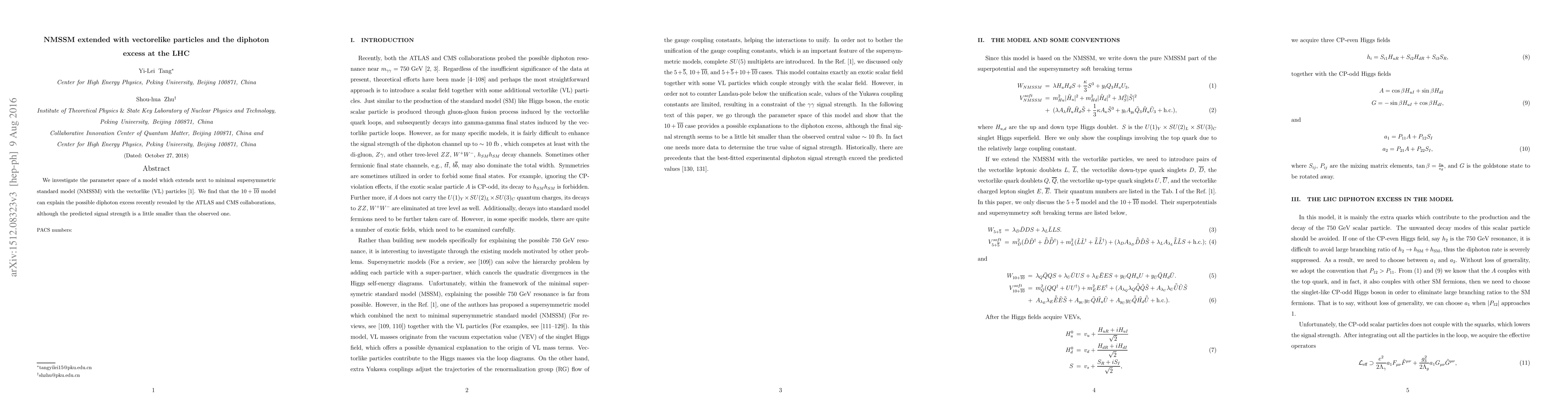 We investigate the parameter space of a model which extends next to minimal supersymmetric standard model (NMSSM) with the vectorlike (VL) particles. We find that the $10+\overline{10}$ model can explain the possible diphoton excess recently revealed by the ATLAS and CMS collaborations, although the predicted signal strength is a little smaller than the observed one.