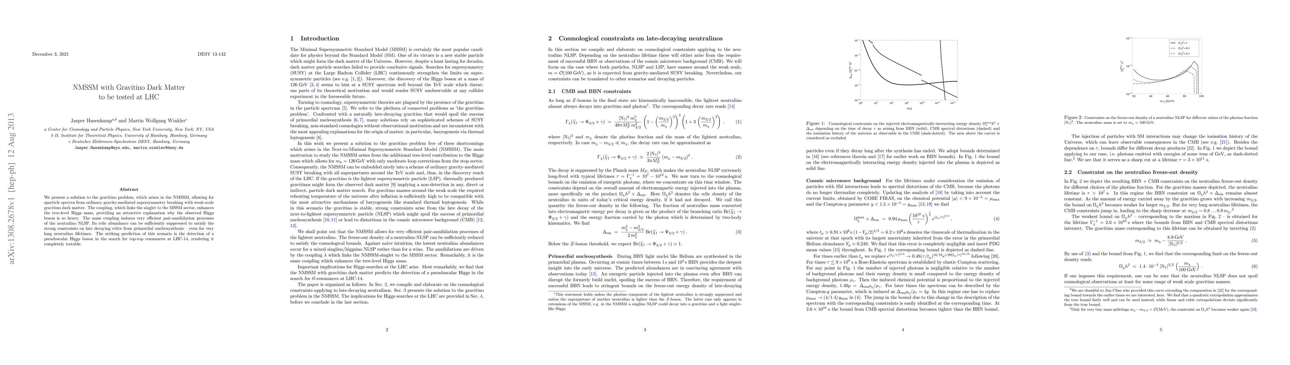 We present a solution to the gravitino problem, which arises in the NMSSM, allowing for sparticle spectra from ordinary gravity-mediated supersymmetry breaking with weak-scale gravitino dark matter. The coupling, which links the singlet to the MSSM sector, enhances the tree-level Higgs mass, providing an attractive explanation why the observed Higgs boson is so heavy. The same coupling induces very efficient pair-annihilation processes of the neutralino NLSP. Its relic abundance can be sufficiently suppressed to satisfy the strong constraints on late decaying relics from primordial nucleosynthesis -- even for very long neutralino lifetimes. The striking prediction of this scenario is the detection of a pseudoscalar Higgs boson in the search for top-top resonances at LHC-14, rendering it completely testable.