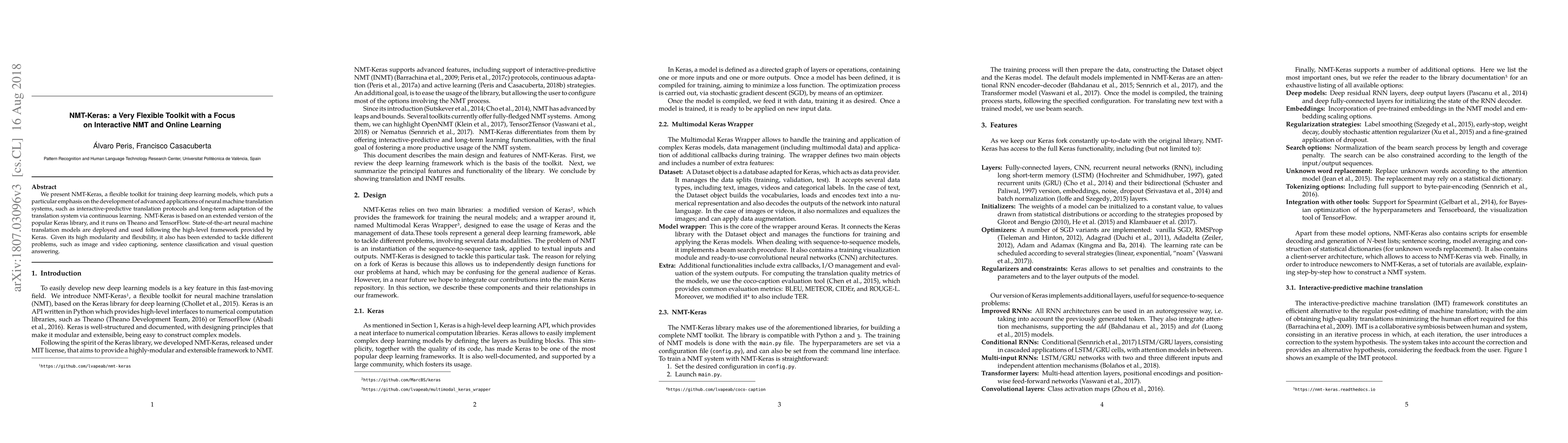 NMT-Keras is a versatile toolkit for training deep learning models, emphasizing interactive neural machine translation and online learning. It extends Keras for state-of-the-art neural machine translation, with flexibility to address various tasks like image captioning and visual question answering.