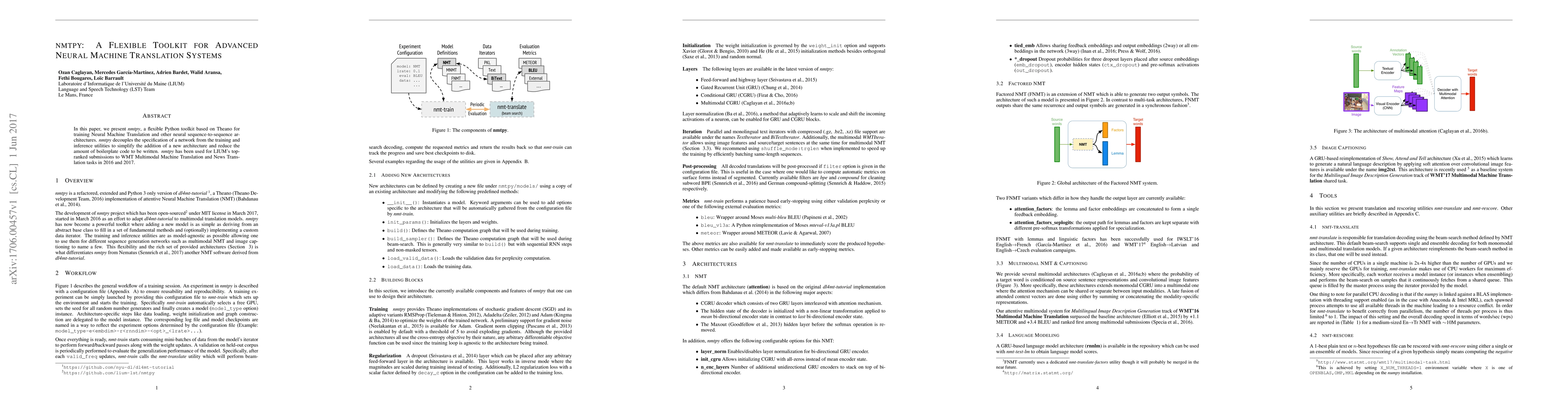 nmtpy is a Python toolkit for training Neural Machine Translation systems based on Theano, designed to simplify the addition of new architectures and reduce boilerplate code. It was instrumental in LIUM's top-ranked submissions to WMT Multimodal and News Translation tasks in 2016 and 2017.