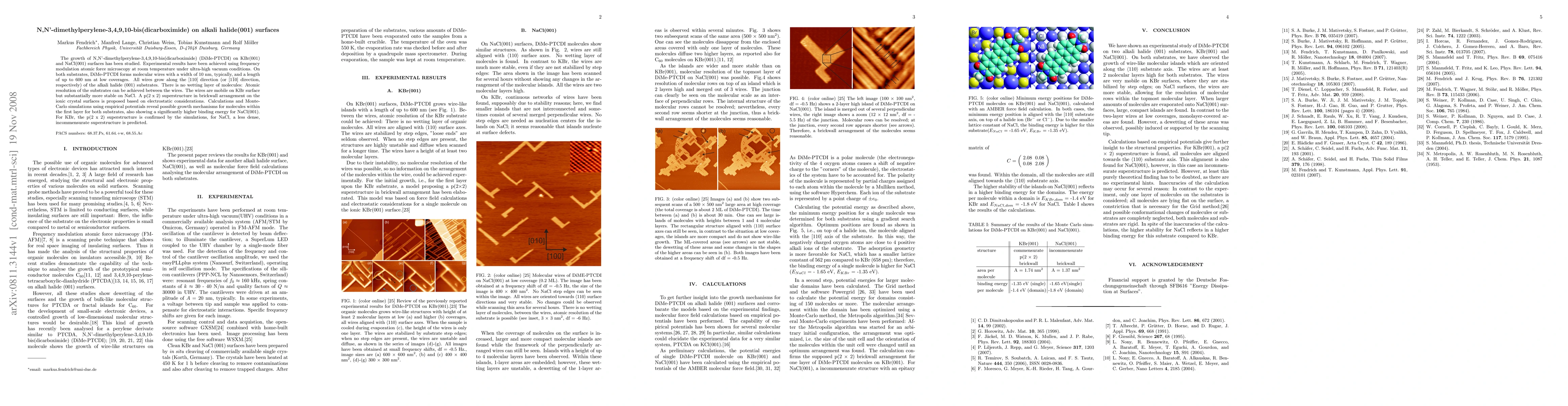 This study investigates the growth of DiMe-PTCDI molecules on KBr(001) and NaCl(001) surfaces, revealing the formation of molecular wires with a width of 10 nm and lengths up to 600 nm, primarily aligned along the [110] direction. The molecules form a p(2 x 2) superstructure on KBr and a less dense, incommensurate arrangement on NaCl, with higher stability on the latter.