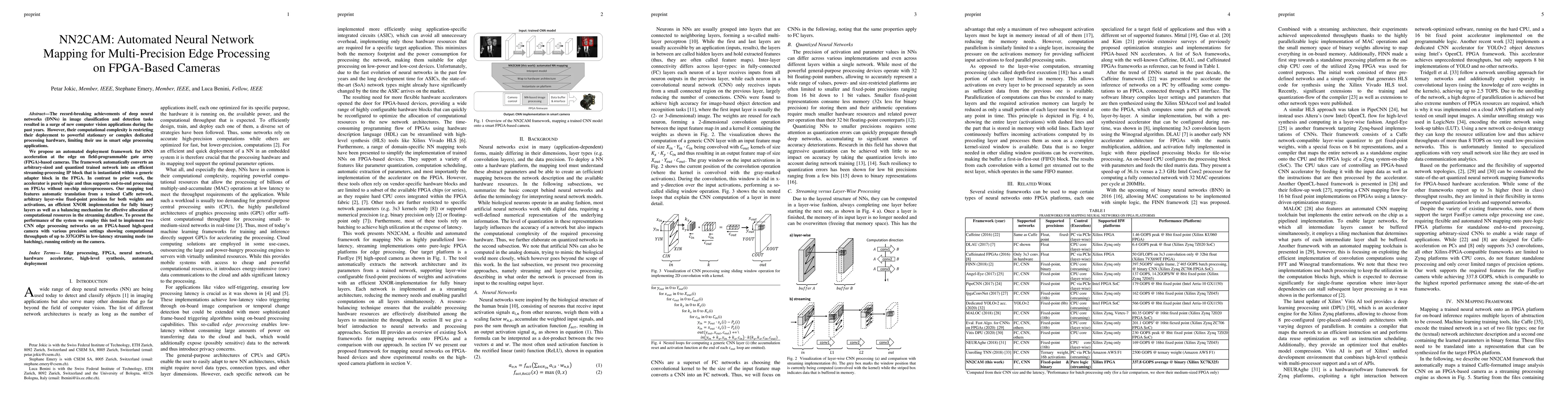 The paper introduces NN2CAM, an automated framework for deploying deep neural networks on FPGA-based cameras for edge processing, featuring logic-only acceleration, multi-precision support, and efficient streaming dataflow. The framework achieves high computational throughputs of up to 337GOPS on a high-speed camera without using on-chip microprocessors.