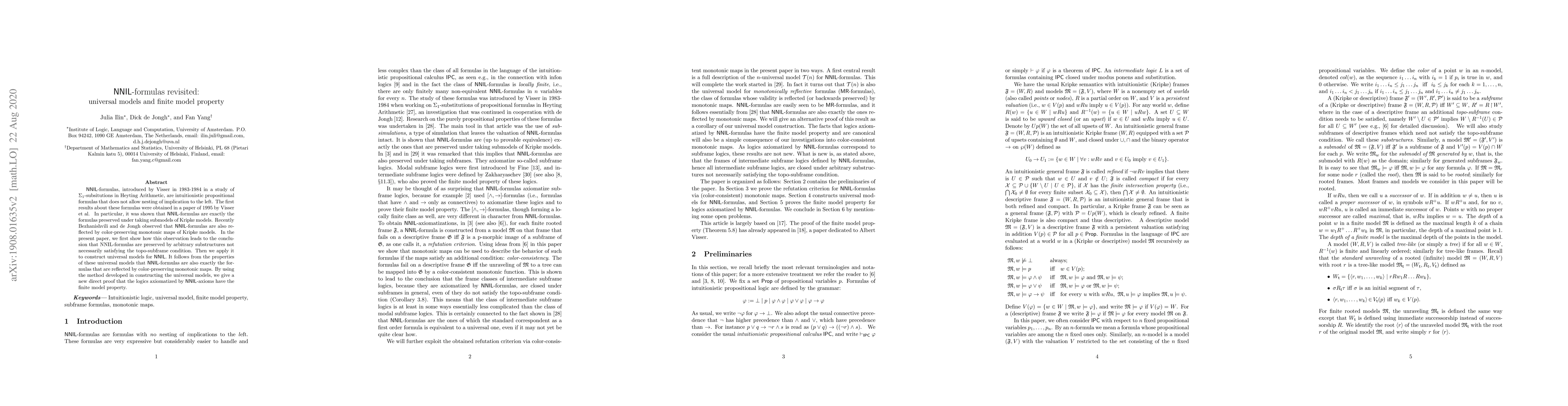 Researchers found that NNIL-formulas, a type of intuitionistic propositional formula, preserve certain properties under substructures of Kripke models, leading to universal models and the finite model property for logics axiomatized by NNIL-axioms.