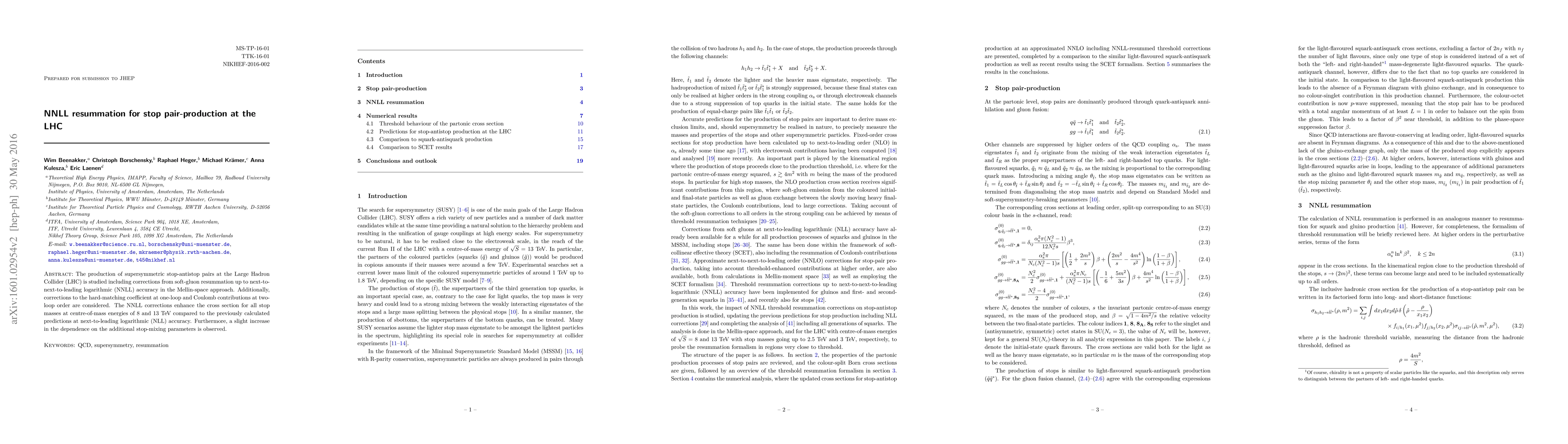 This paper provides a detailed study of stop-antistop pair production at the LHC, incorporating NNLL resummation corrections and hard-matching coefficients, which enhance the predicted cross-section compared to NLL predictions, and slightly increase the sensitivity to stop-mixing parameters.
