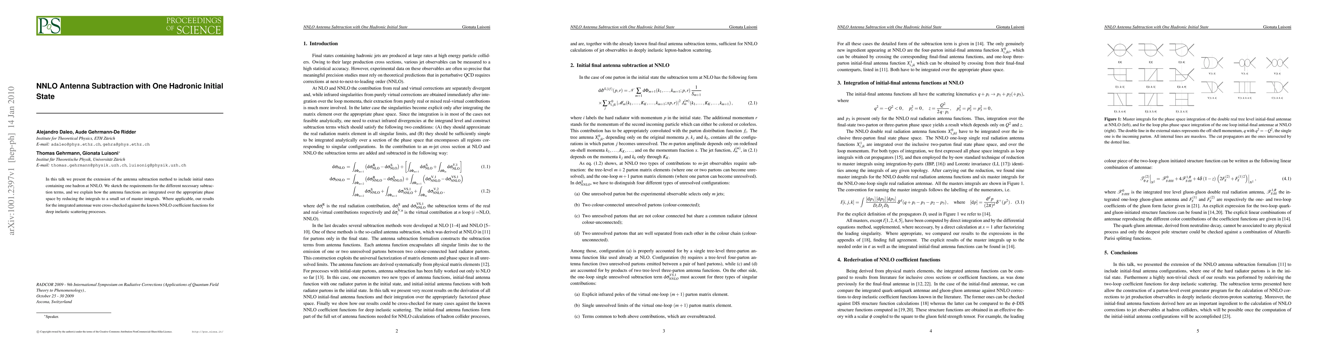 This paper extends the antenna subtraction method to include one hadronic initial state at next-to-next-to-leading order (NNLO), detailing the necessary subtraction terms and integrating antenna functions over the relevant phase space using a reduced set of master integrals. Cross-checks were performed against known NNLO coefficient functions for deep inelastic scattering.