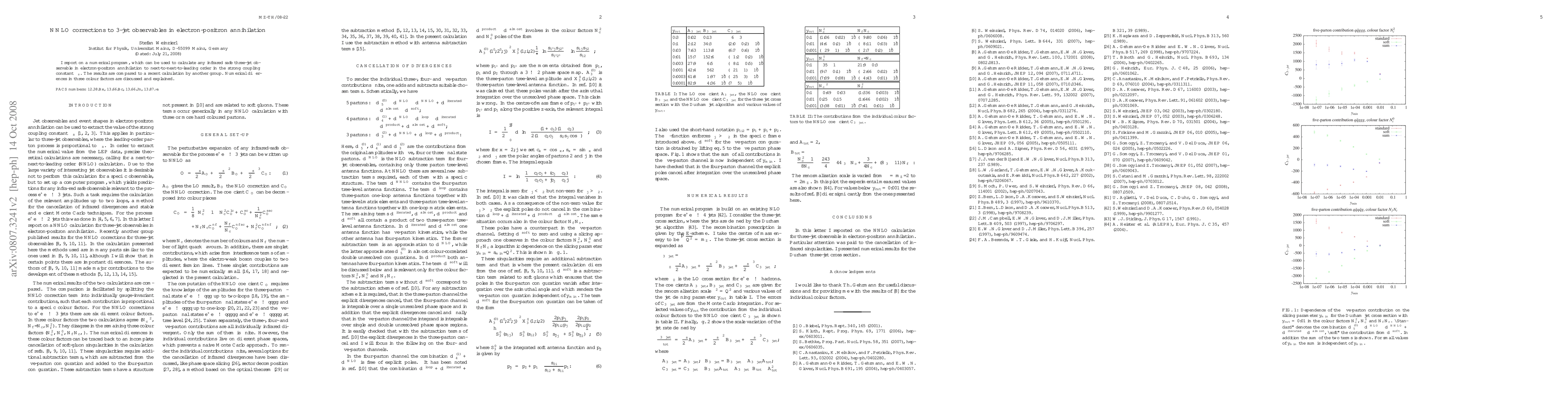 I report on a numerical program, which can be used to calculate any infrared safe three-jet observable in electron-positron annihilation to next-to-next-to-leading order in the strong coupling constant alpha_s. The results are compared to a recent calculation by another group. Numerical differences in three colour factors are discussed and explained.