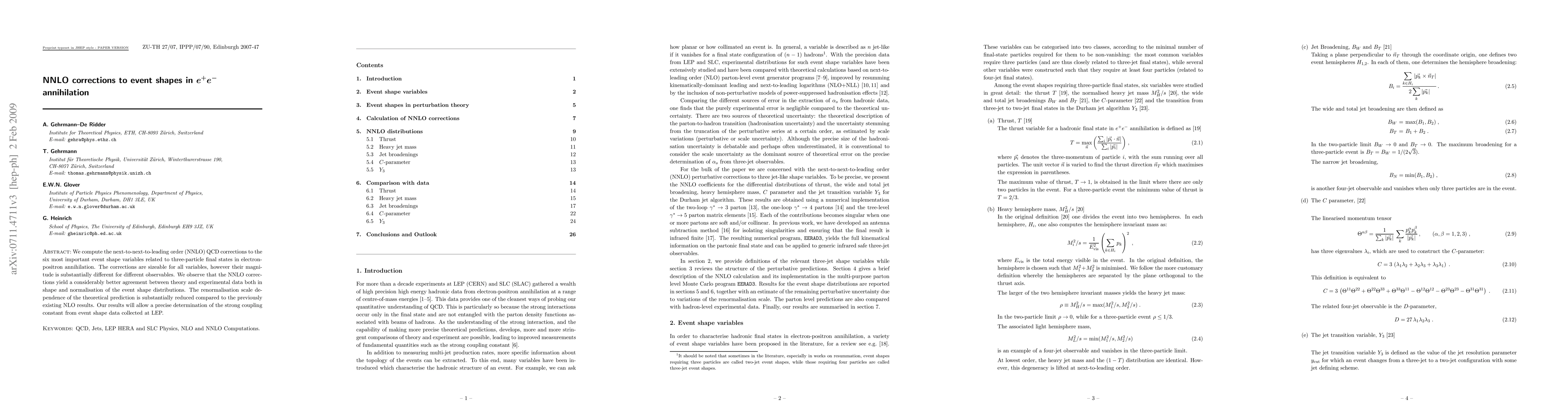 This paper computes next-to-next-to-leading order (NNLO) QCD corrections to six key event shape variables in electron-positron annihilation, showing significant improvements in agreement between theory and experimental data. The NNLO corrections reduce the renormalisation scale dependence and enable a more precise determination of the strong coupling constant.