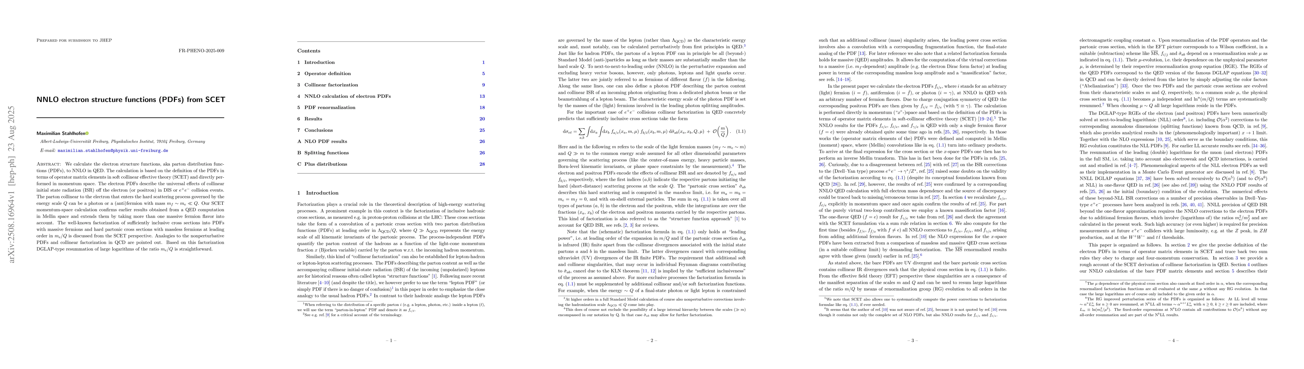 We calculate the electron structure functions, aka parton distribution functions (PDFs), to NNLO in QED. The calculation is based on the definition of the PDFs in terms of operator matrix elements in soft collinear effective theory (SCET) and directly performed in momentum space. The electron PDFs describe the universal effects of collinear initial state radiation (ISR) off the electron (or positron) in DIS or $e^+ e^-$ collision events. The parton collinear to the electron that enters the hard scattering process governed by the energy scale $Q$ can be a photon or a (anti)fermion with mass $m_f \sim m_e \ll Q$. Our SCET momentum-space calculation confirms earlier results obtained from a QED computation in Mellin space and extends them by taking more than one massive fermion flavor into account. The well-known factorization of sufficiently inclusive cross sections into PDFs with massive fermions and hard partonic cross sections with massless fermions at leading order in $m_e/Q$ is discussed from the SCET perspective. Analogies to the nonperturbative PDFs and collinear factorization in QCD are pointed out. Based on this factorization DGLAP-type resummation of large logarithms of the ratio $m_e/Q$ is straightforward.
