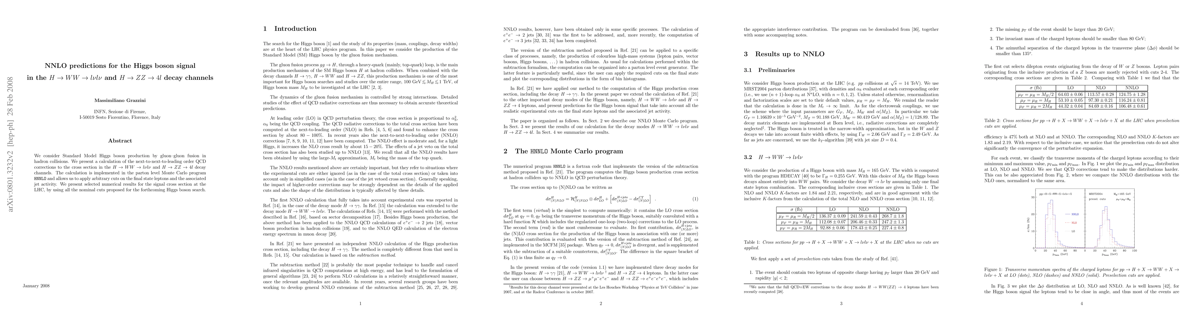 We consider Standard Model Higgs boson production by gluon--gluon fusion in hadron collisions. We present a calculation of the next-to-next-to-leading order QCD corrections to the cross section in the H->WW->lnu lnu and H->ZZ->4l decay channels. The calculation is implemented in the parton level Monte Carlo program HNNLO and allows us to apply arbitrary cuts on the final state leptons and the associated jet activity. We present selected numerical results for the signal cross section at the LHC, by using all the nominal cuts proposed for the forthcoming Higgs boson search.