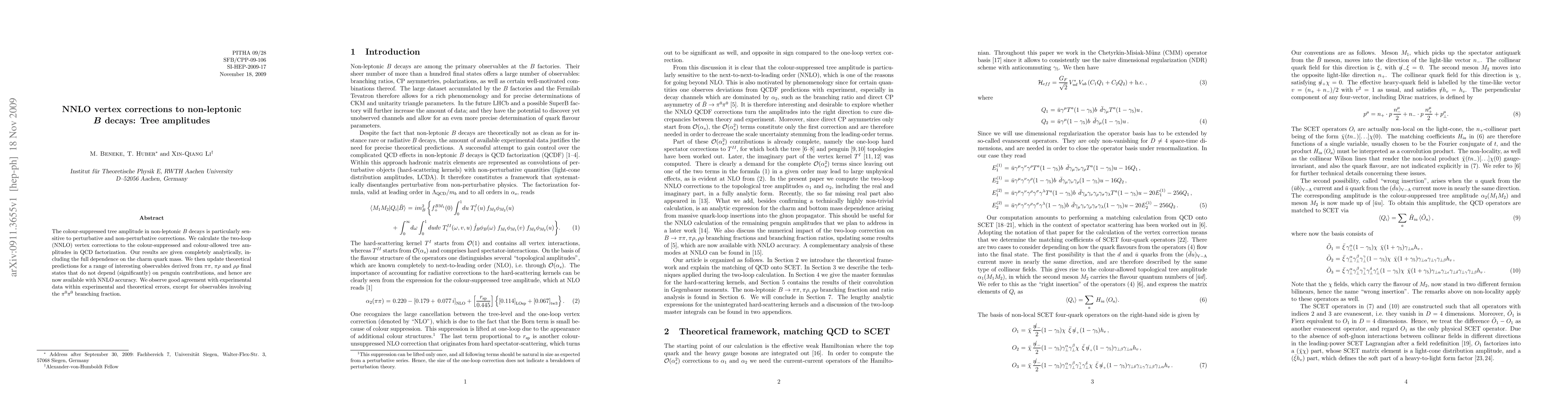 This paper calculates two-loop (NNLO) vertex corrections for the colour-suppressed and colour-allowed tree amplitudes in non-leptonic B decays, providing analytical results with full charm quark mass dependence. The updated theoretical predictions for selected observables show good agreement with experimental data, except for the pi^0 pi^0 branching fraction.