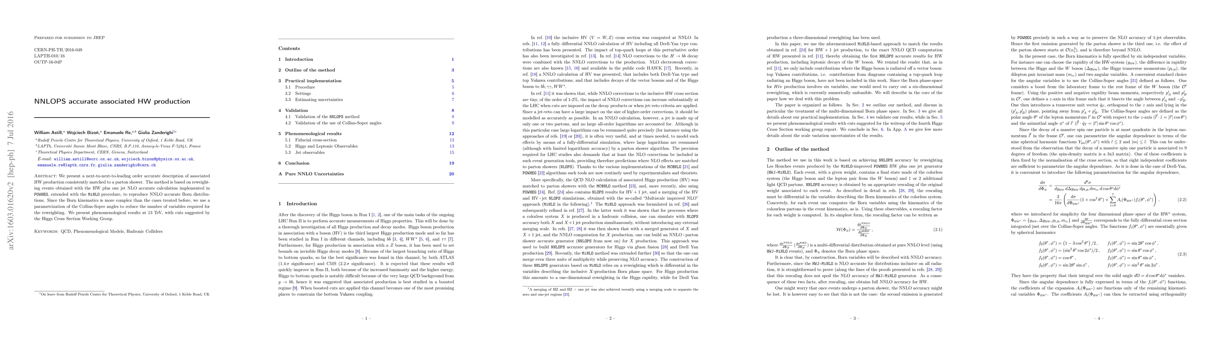 This paper introduces a next-to-next-to-leading order (NNLO) accurate method for describing associated HW production, combining it with a parton shower. The approach involves reweighting events from the HW plus one jet NLO calculation in POWHEG, enhanced with the MiNLO procedure, to align with NNLO Born distributions. A parametrization of Collins-Soper angles is employed to manage the increased complexity of Born kinematics, with phenomenological results presented for 13 TeV collisions under Higgs Cross Section Working Group cuts.