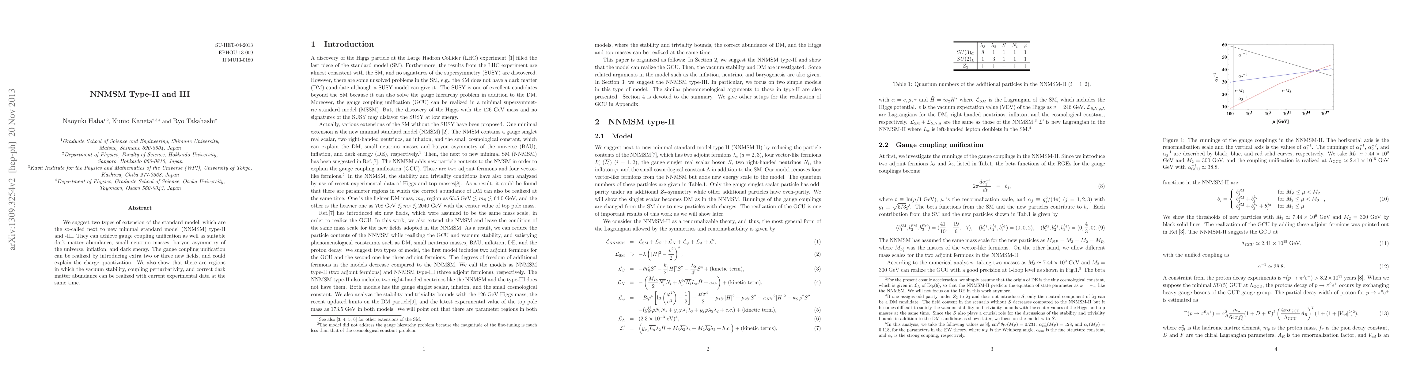 We suggest two types of extension of the standard model, which are the so-called next to new minimal standard model (NNMSM) type-II and -III. They can achieve gauge coupling unification as well as suitable dark matter abundance, small neutrino masses, baryon asymmetry of the universe, inflation, and dark energy. The gauge coupling unification can be realized by introducing extra two or three new fields, and could explain the charge quantization. We also show that there are regions in which the vacuum stability, coupling perturbativity, and correct dark matter abundance can be realized with current experimental data at the same time.