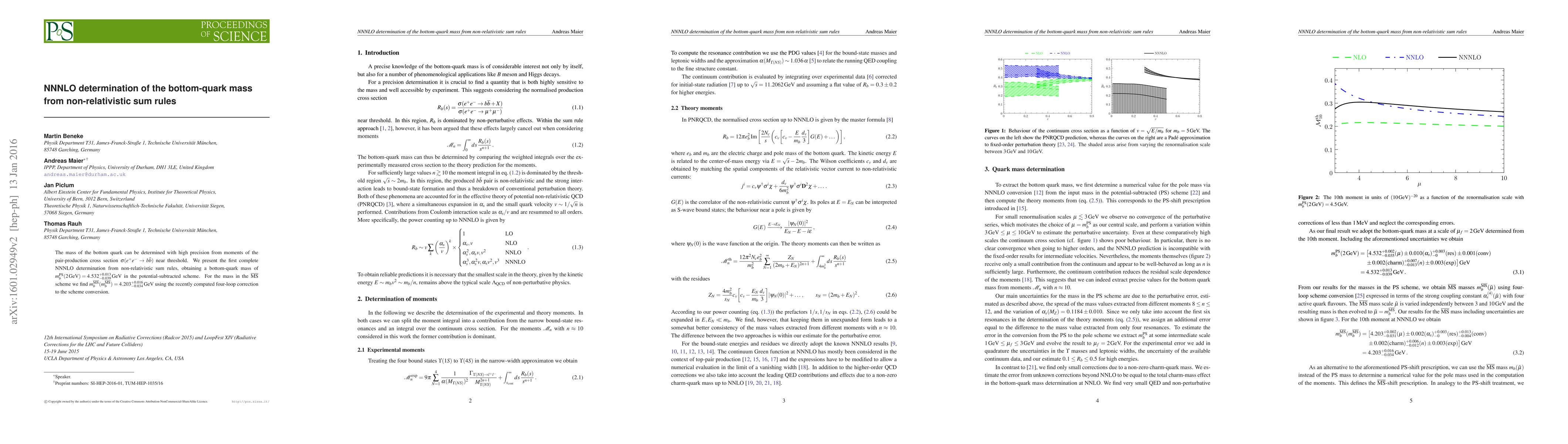This paper presents the first complete next-to-next-to-next-to-leading logarithmic order (NNNLO) determination of the bottom-quark mass using non-relativistic sum rules, yielding mb^PS(2 GeV) = (4.532 ± 0.013 - 0.039) GeV in the potential-subtracted scheme and mb^MS(mb^MS) = (4.203 ± 0.016 - 0.034) GeV in the MSbar scheme.