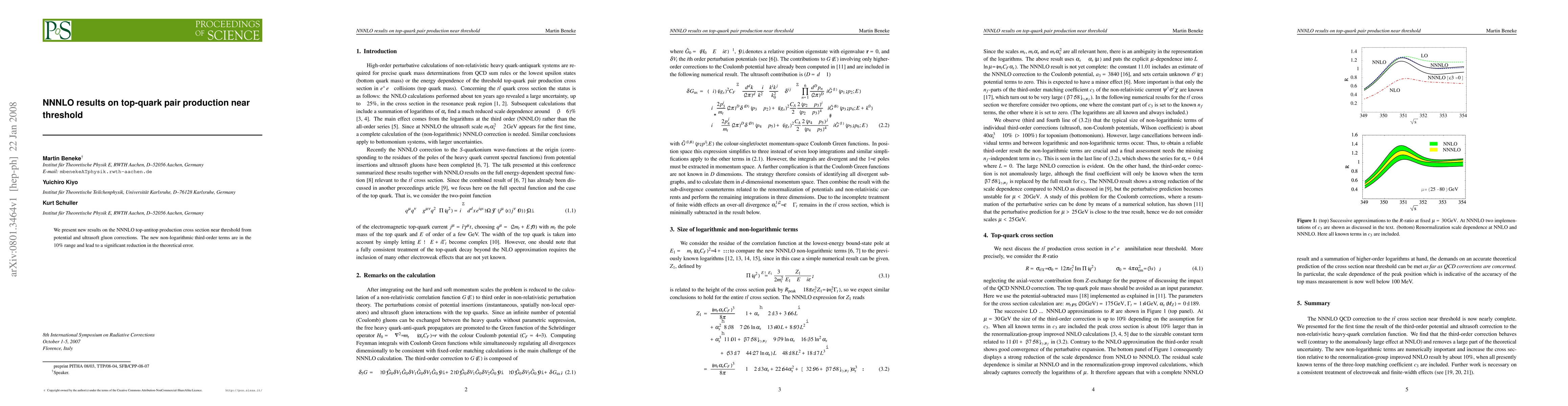 This paper presents new NNNLO results for top-quark pair production near threshold, incorporating potential and ultrasoft gluon corrections that significantly reduce the theoretical error by introducing non-logarithmic third-order terms in the 10% range.