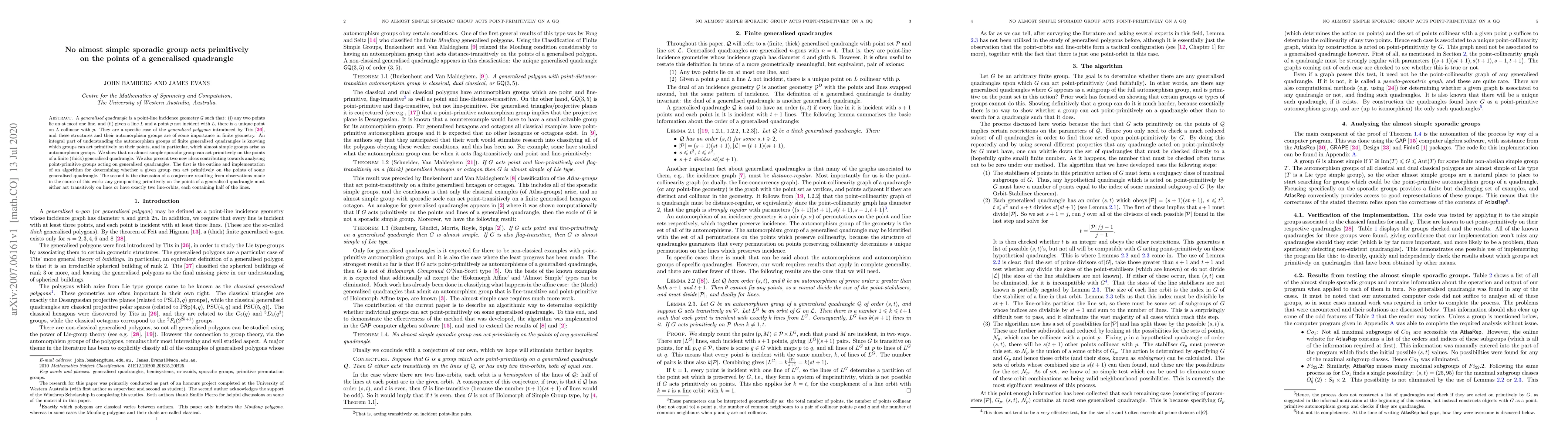 A generalised quadrangle is a point-line incidence geometry G such that: (i) any two points lie on at most one line, and (ii) given a line L and a point p not incident with L, there is a unique point on L collinear with p. They are a specific case of the generalised polygons introduced by Tits, and these structures and their automorphism groups are of some importance in finite geometry. An integral part of understanding the automorphism groups of finite generalised quadrangles is knowing which groups can act primitively on their points, and in particular, which almost simple groups arise as automorphism groups. We show that no almost simple sporadic group can act primitively on the points of a finite (thick) generalised quadrangle. We also present two new ideas contributing towards analysing point-primitive groups acting on generalised quadrangles. The first is the outline and implementation of an algorithm for determining whether a given group can act primitively on the points of some generalised quadrangle. The second is the discussion of a conjecture resulting from observations made in the course of this work: any group acting primitively on the points of a generalised quadrangle must either act transitively on lines or have exactly two line-orbits, each containing half of the lines.