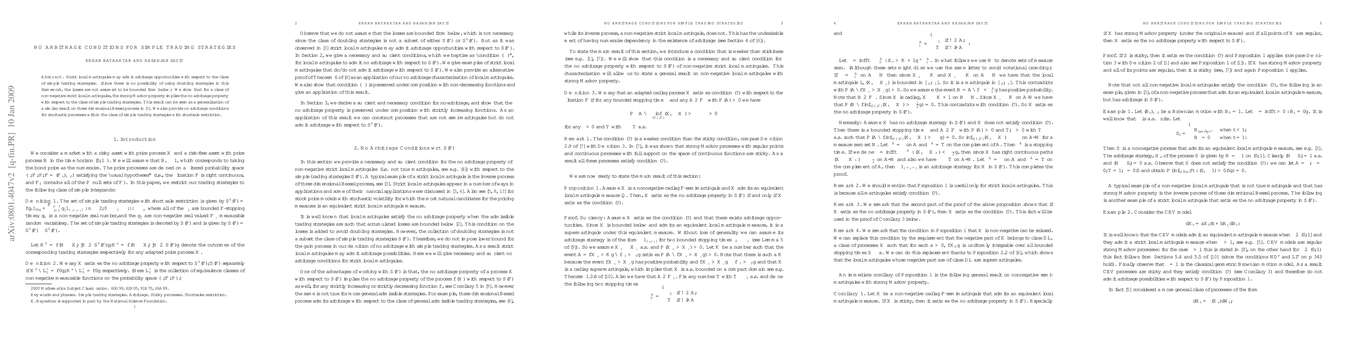 This paper demonstrates that non-negative strict local martingales with the strong Markov property exhibit no arbitrage conditions for simple trading strategies, generalizing a result from three-dimensional Bessel processes. It also provides no arbitrage conditions for stochastic processes under simple strategies with shortsale restrictions.