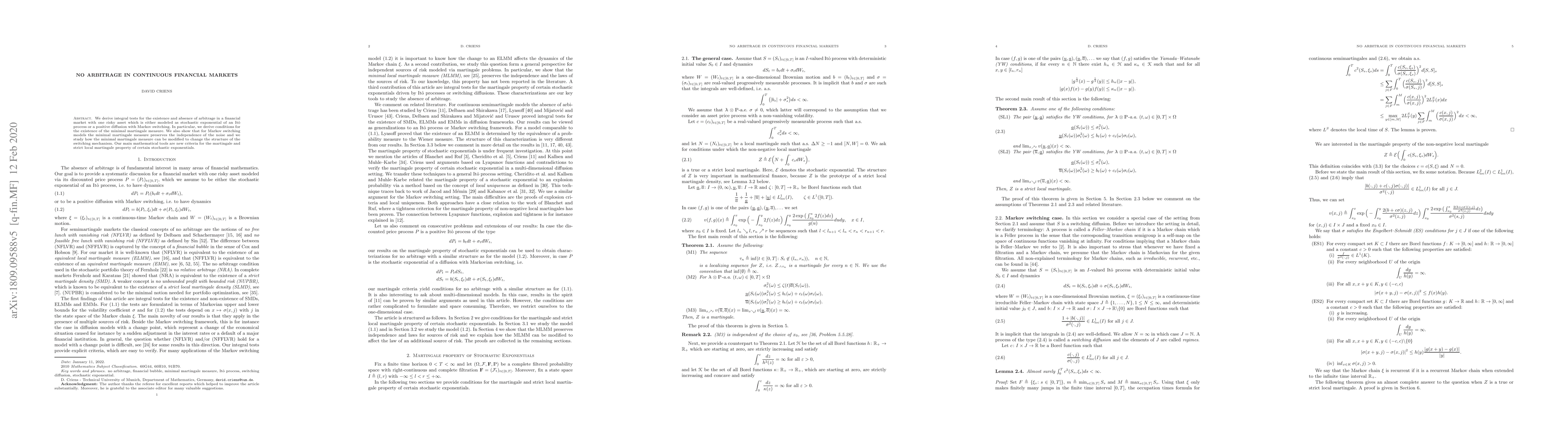 This paper develops integral tests to determine the presence or absence of arbitrage in continuous financial markets with a single risky asset, modeled either as a stochastic exponential of an Ito process or a positive diffusion with Markov switching. It establishes conditions for the existence of the minimal martingale measure and explores modifications to the switching mechanism.