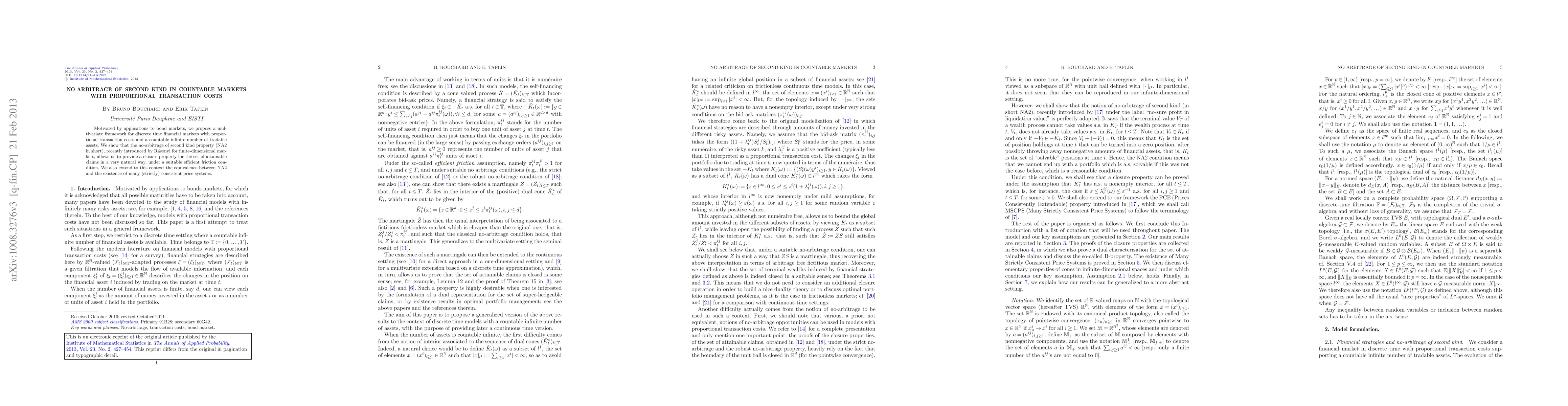 Motivated by applications to bond markets, we propose a multivariate framework for discrete time financial markets with proportional transaction costs and a countable infinite number of tradable assets. We show that the no-arbitrage of second kind property (NA2 in short), recently introduced by Rasonyi for finite-dimensional markets, allows us to provide a closure property for the set of attainable claims in a very natural way, under a suitable efficient friction condition. We also extend to this context the equivalence between NA2 and the existence of many (strictly) consistent price systems.