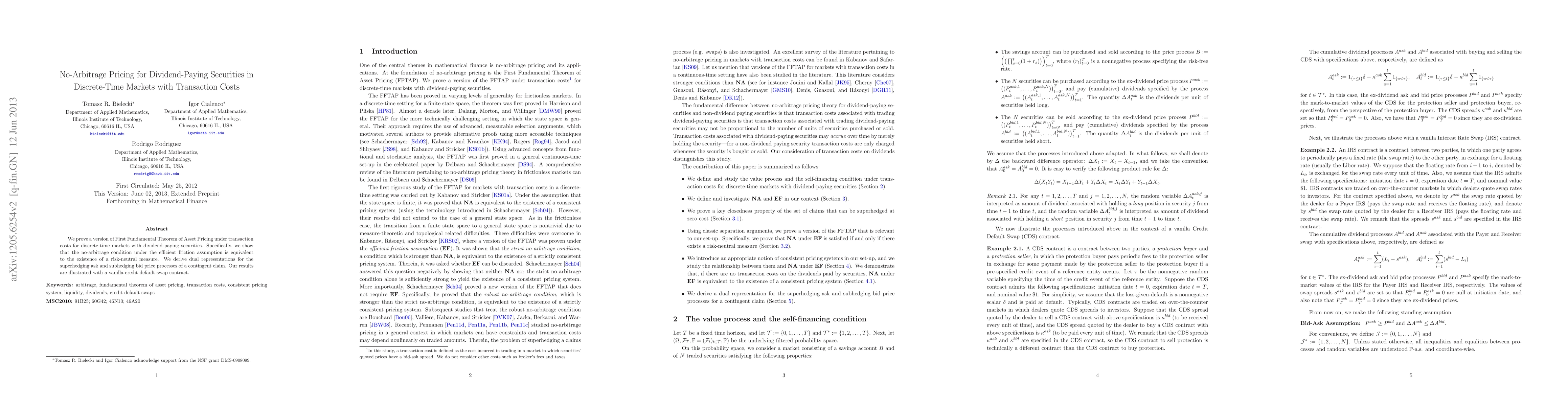 This paper proves a version of the First Fundamental Theorem of Asset Pricing under transaction costs for discrete-time markets with dividend-paying securities, showing the equivalence between no-arbitrage and the existence of a risk-neutral measure. The study also derives dual representations for superhedging and subhedging prices, illustrated with a vanilla credit default swap.
