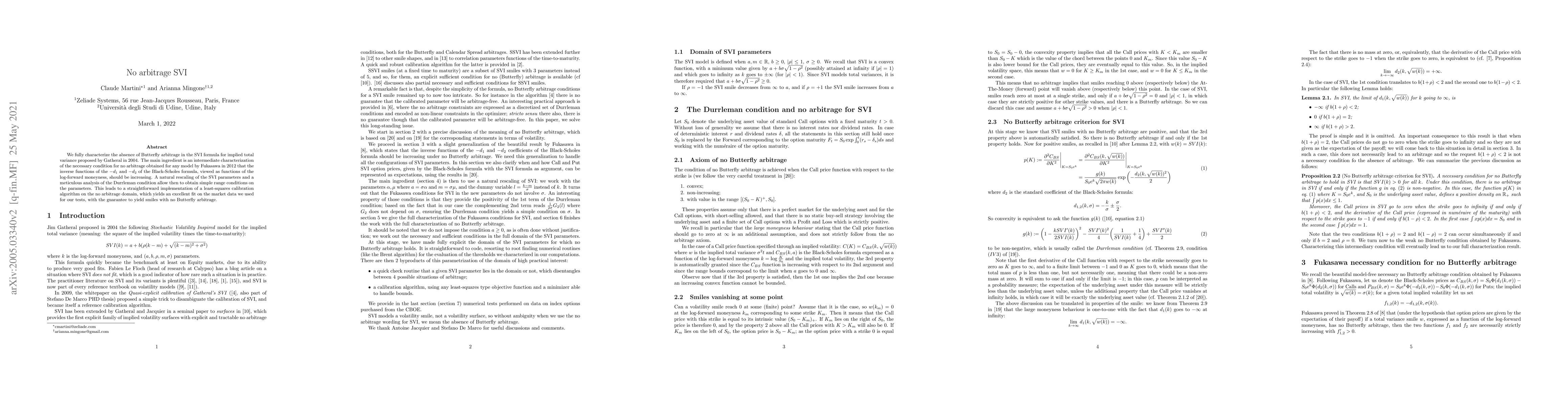 We fully characterize the absence of Butterfly arbitrage in the SVI formula for implied total variance proposed by Gatheral in 2004. The main ingredient is an intermediary characterization of the necessary condition for no arbitrage obtained for any model by Fukasawa in 2012 that the inverse functions of the -d1 and -d2 of the Black-Scholes formula, viewed as functions of the log-forward moneyness, should be increasing. A natural rescaling of the SVI parameters and a meticulous analysis of the Durrleman condition allow then to obtain simple range conditions on the parameters. This leads to a straightforward implementation of a least-squares calibration algorithm on the no arbitrage domain, which yields an excellent fit on the market data we used for our tests, with the guarantee to yield smiles with no Butterfly arbitrage.
