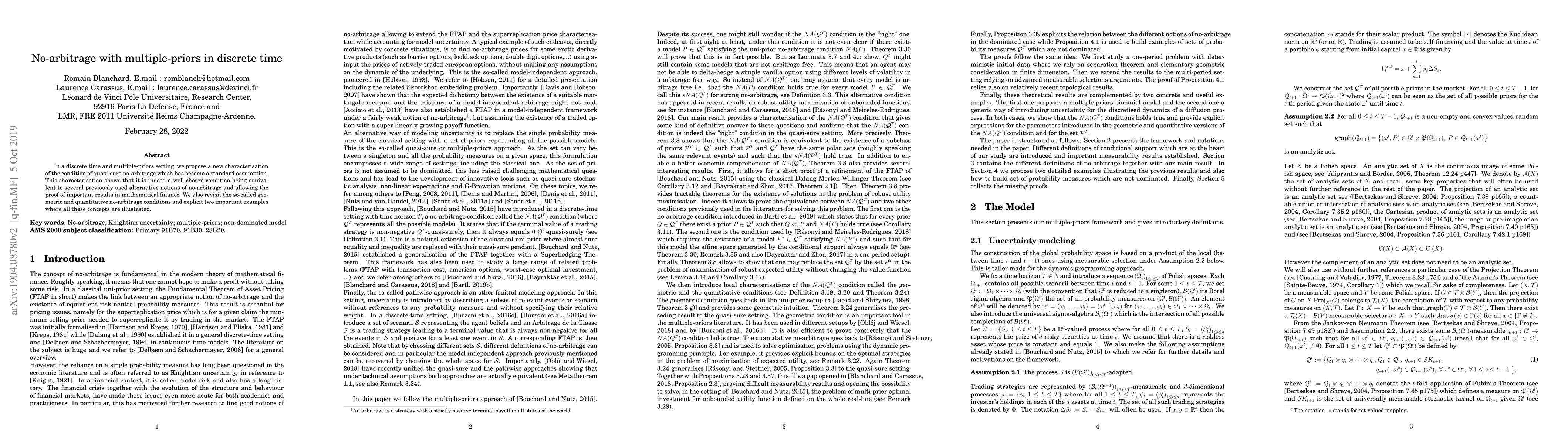 Researchers develop a new characterization of no-arbitrage with multiple priors in discrete time, showing it is equivalent to several alternative notions of no-arbitrage and improves the proof of important results in mathematical finance.